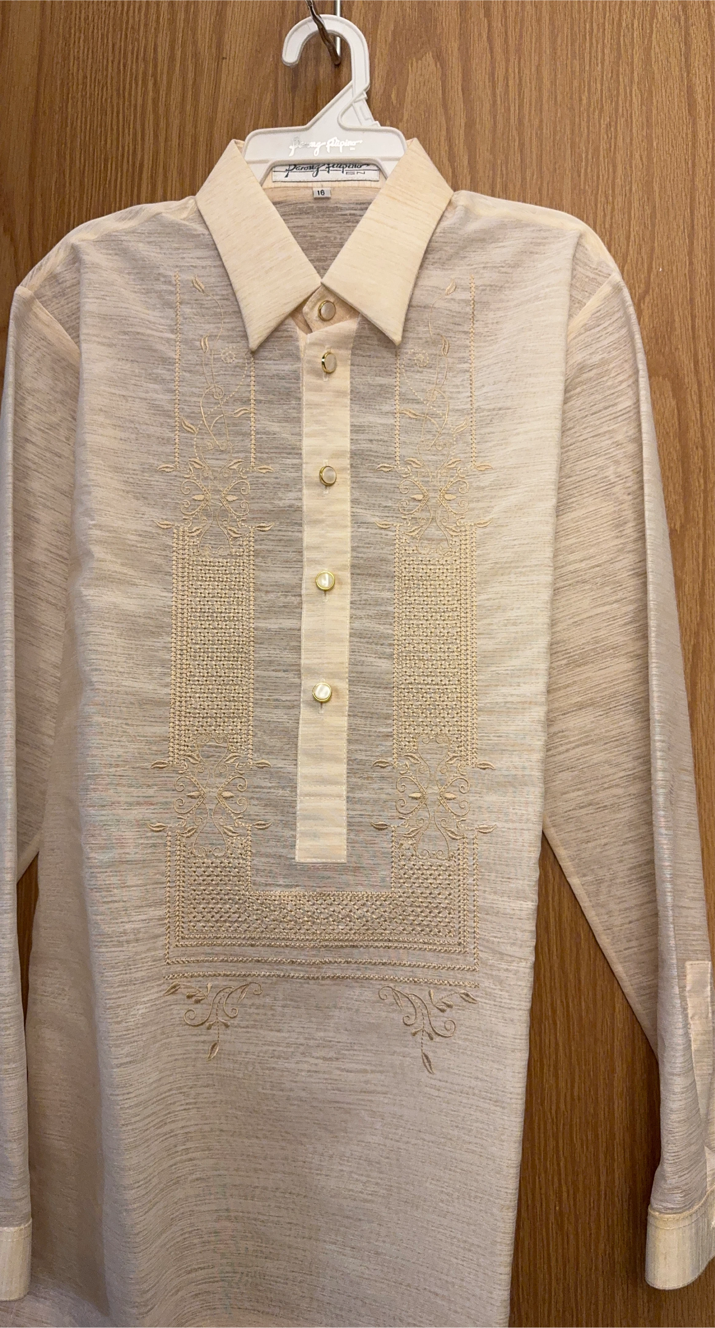 Selling a Barong Tagalog, a traditional Filipino formal shirt. It's a size 16 and in great condition! Perfect for special occasions or cultural events. The intricate embroidery adds a touch of elegance. Feel free to message me with any questions!