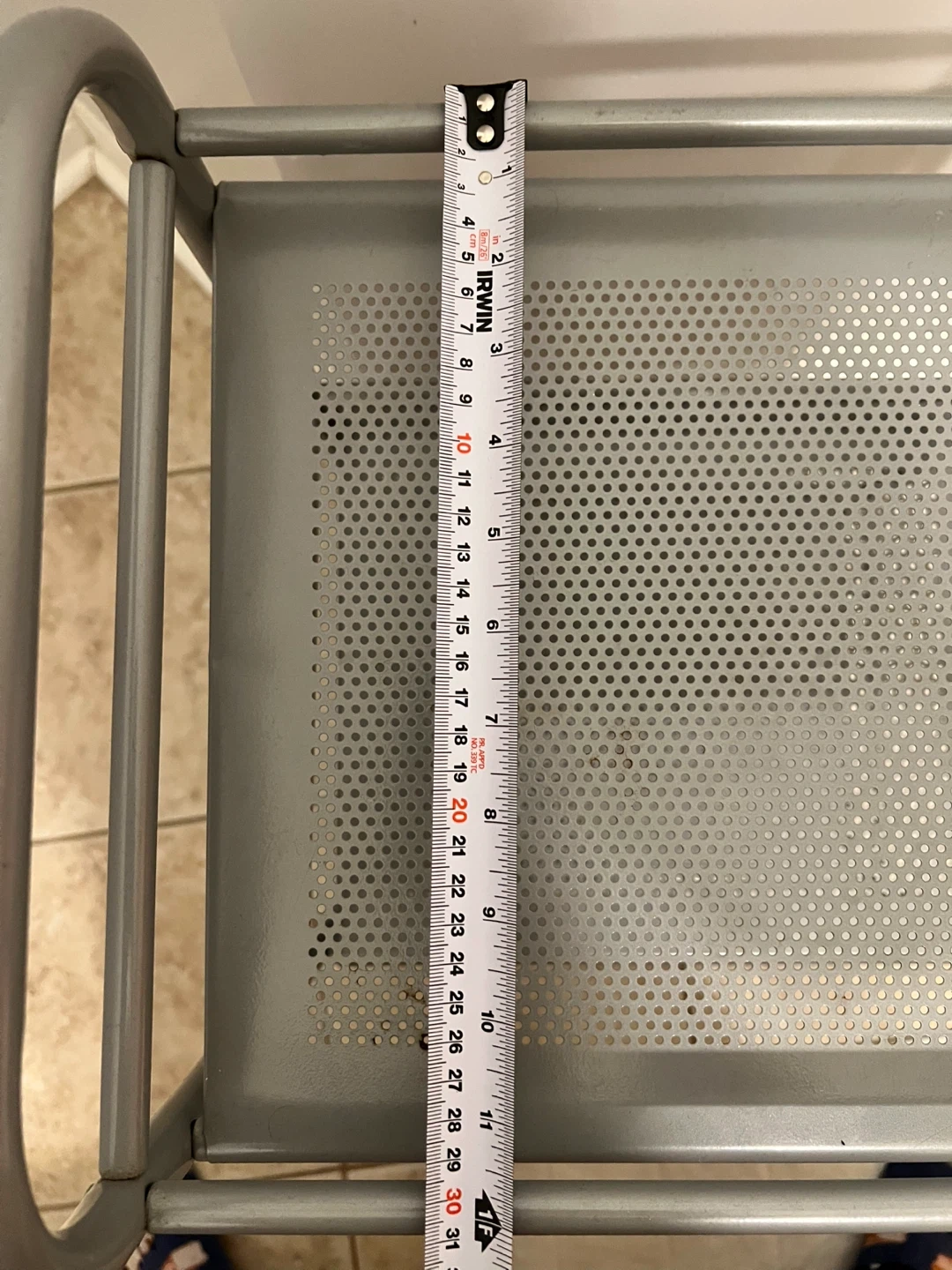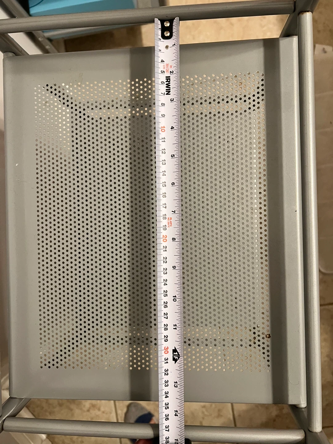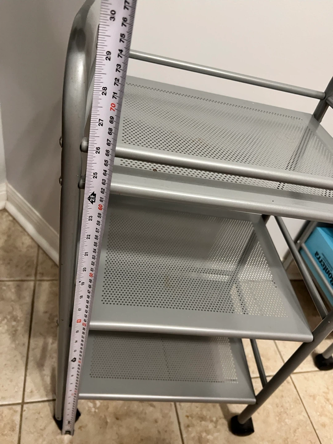 Selling a handy grey rolling cart with three tiers! It's perfect for adding extra storage in your kitchen, bathroom, or craft room. The cart measures about 15 inches wide and 13 inches deep.