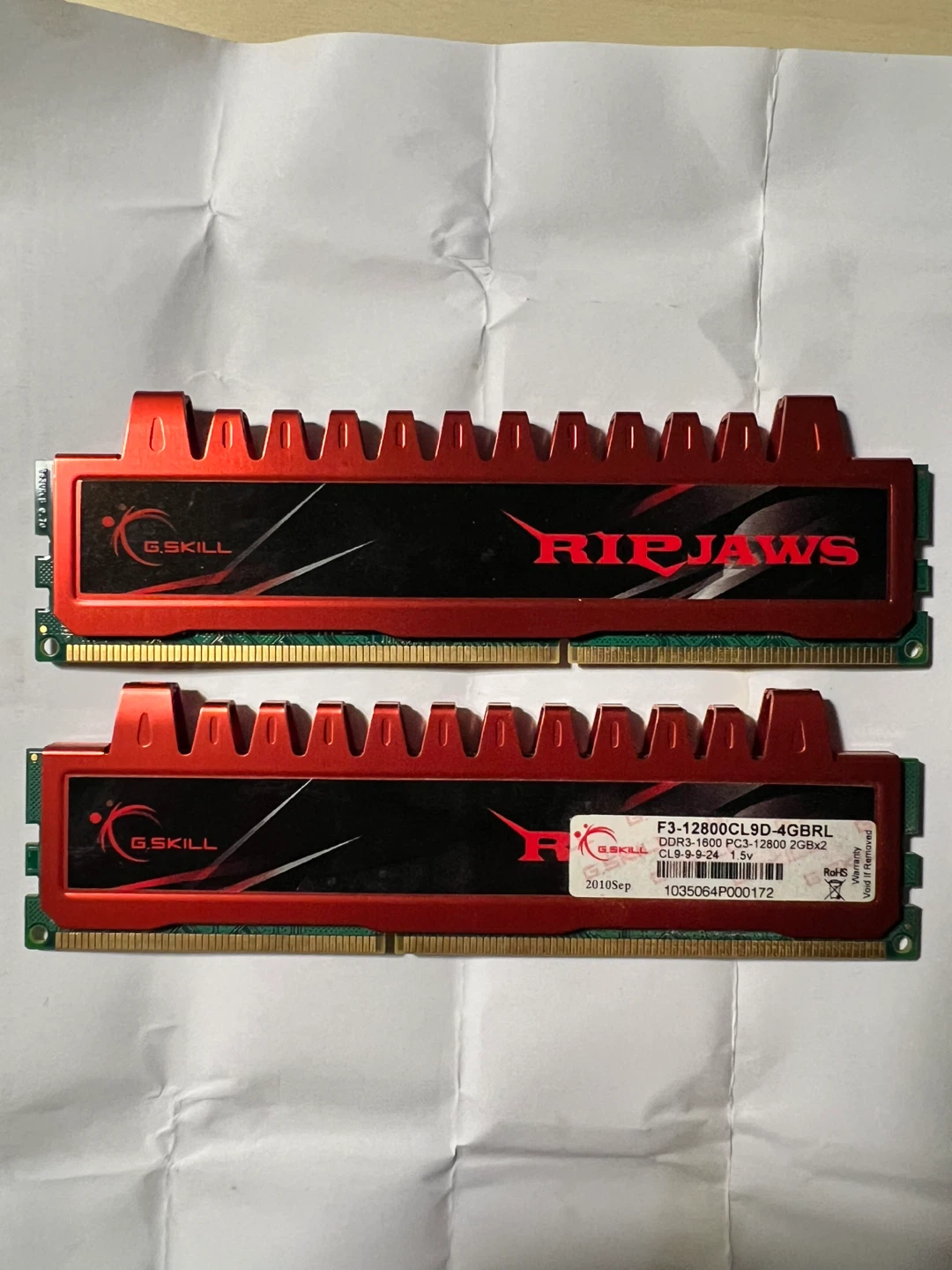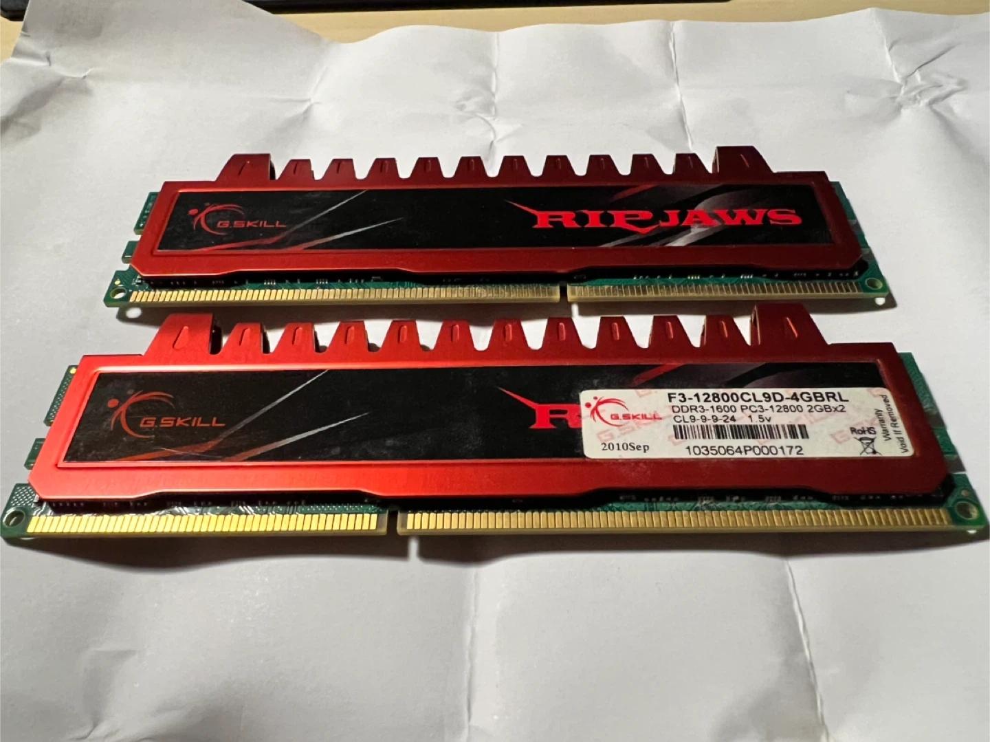 Selling a pair of G.Skill Ripjaws DDR3 4GB RAM sticks. They're in great shape and ready to boost your computer's performance! Model number is F3-12800CL9D-4GBRL. Grab them while they're available
