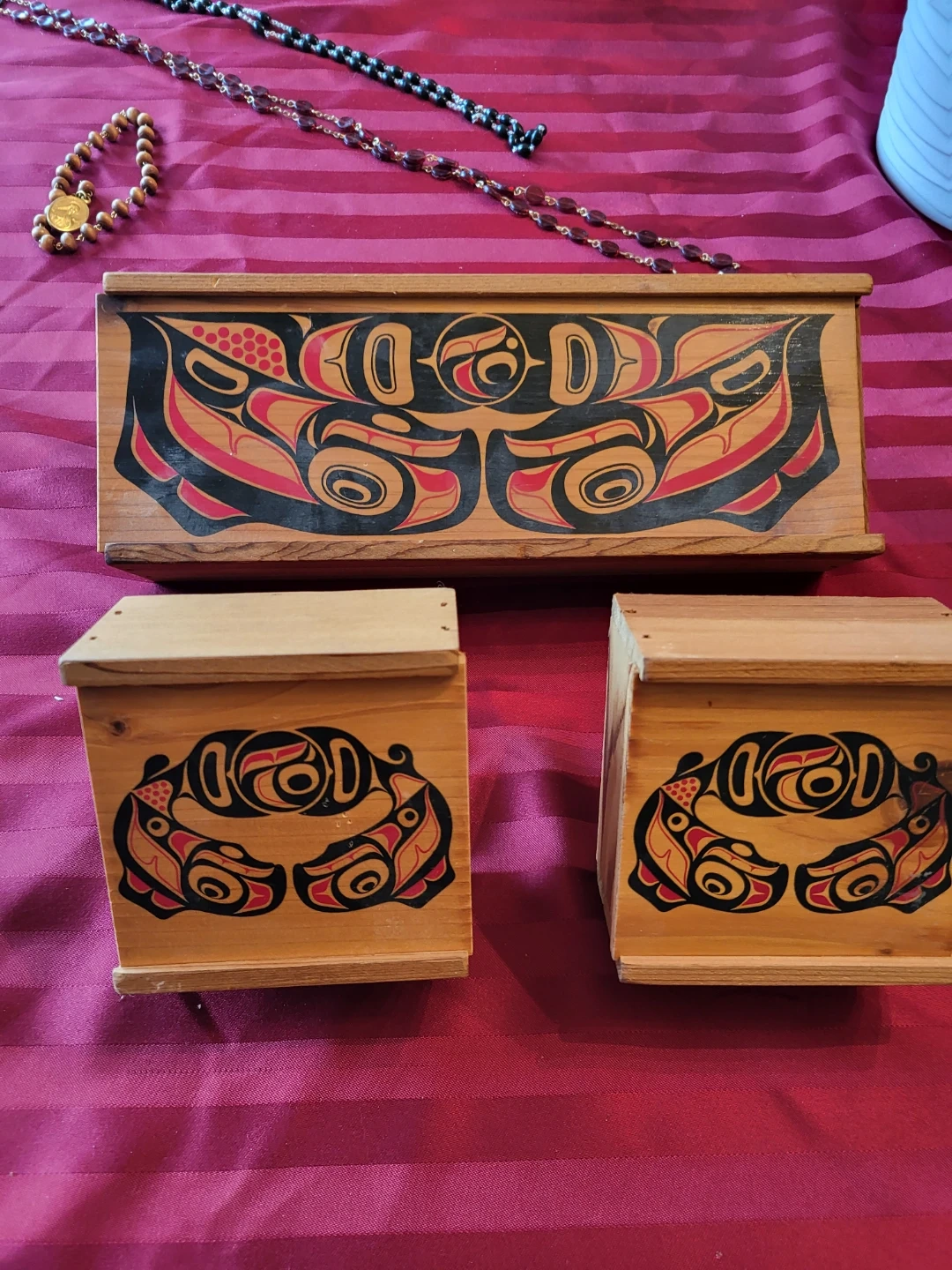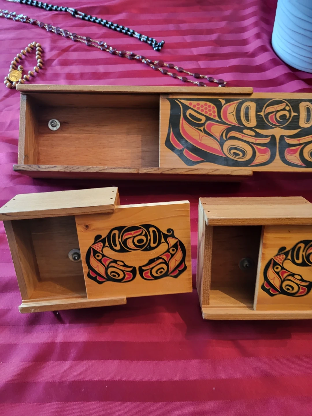 Selling a set of three wooden boxes featuring Indigenous Haida art. They're in great shape and would be a lovely addition to any home! Meant to hang on a wall.