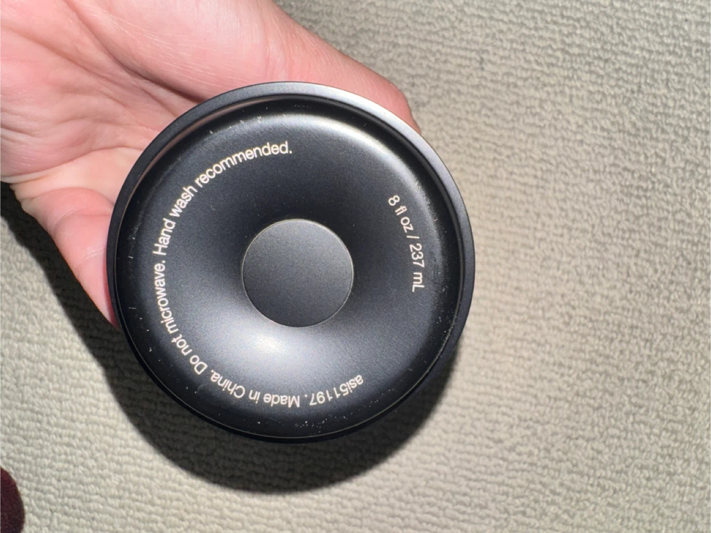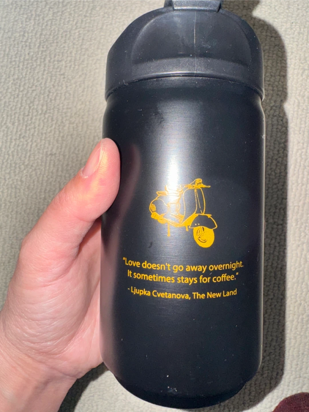 This is a Caffè Artigiano insulated tumbler in black. It holds 8 fl oz / 237 mL. Features a quote and a Vespa design. Great for bringing hot coffee in the mornings.