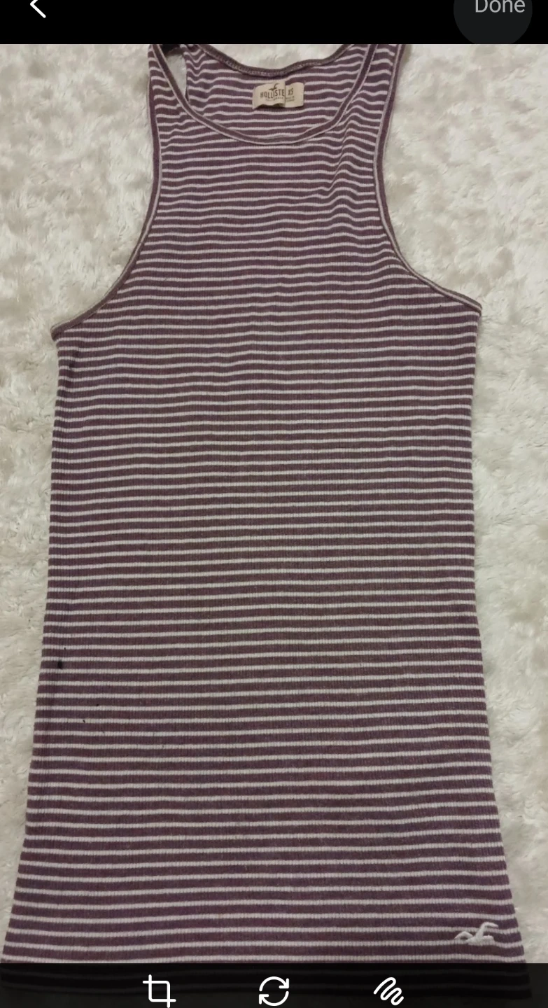 26Cute Hollister tank top in size XS! It features a purple and white striped pattern. Perfect for everyday wear.