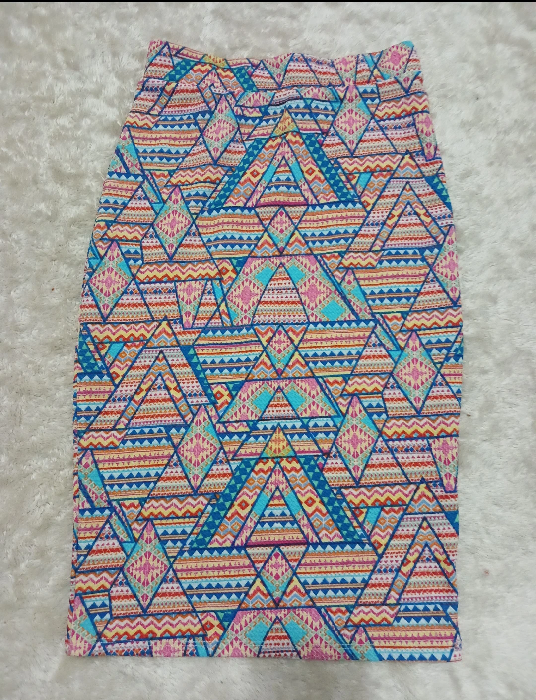 Here's a colourful patterned pencil skirt! It features a mix of triangles and diamond shapes in pink, blue, yellow, and red. It's in great condition and ready for a new home.