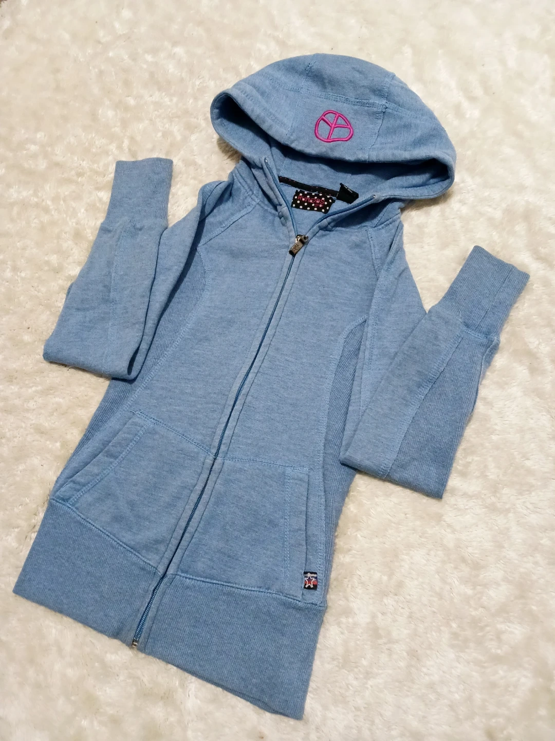 Selling a cute blue full zip hoodie! It features a pink peace sign on the hood and has a comfy, casual fit. Perfect for layering or wearing on its own