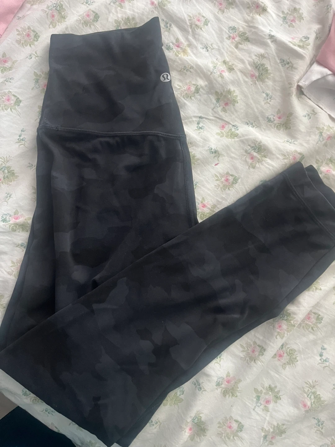 Selling a pair of Lululemon Align leggings in a black camo pattern. They're in great condition and ready for a new home!