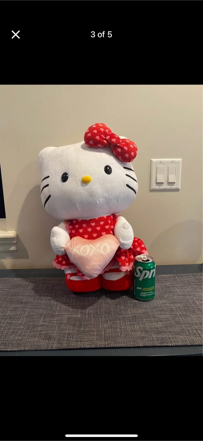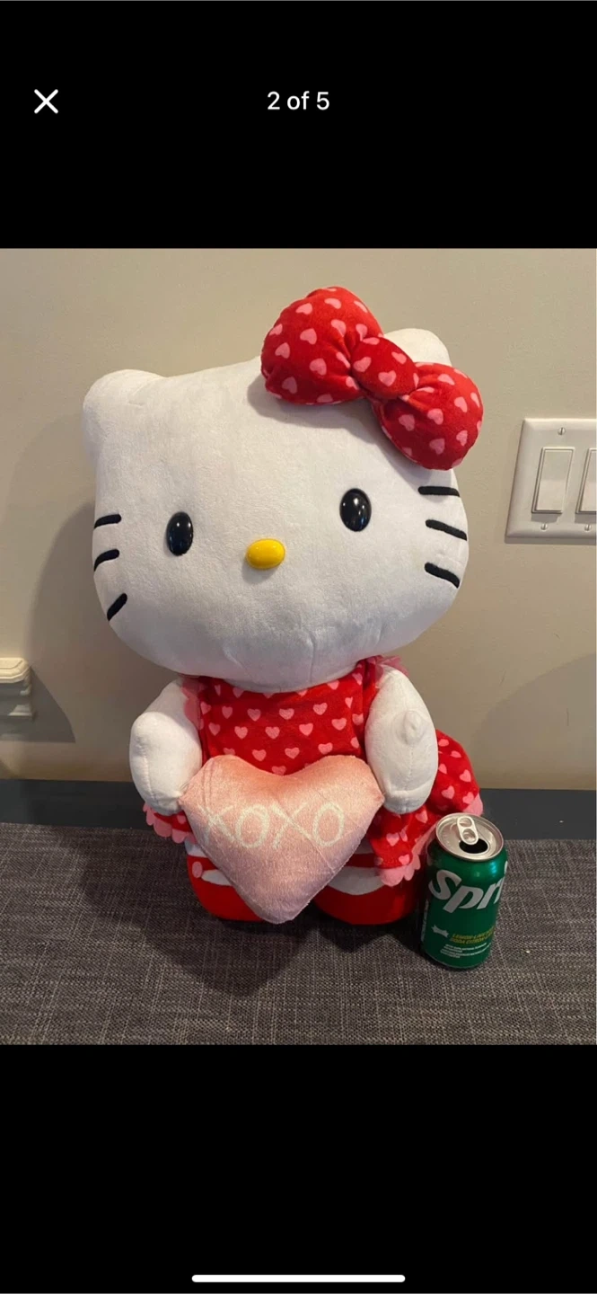 Selling a super cute Hello Kitty plush, perfect for Valentine's Day! She's wearing a red dress with hearts and holding a heart that says XOXO. Great condition!