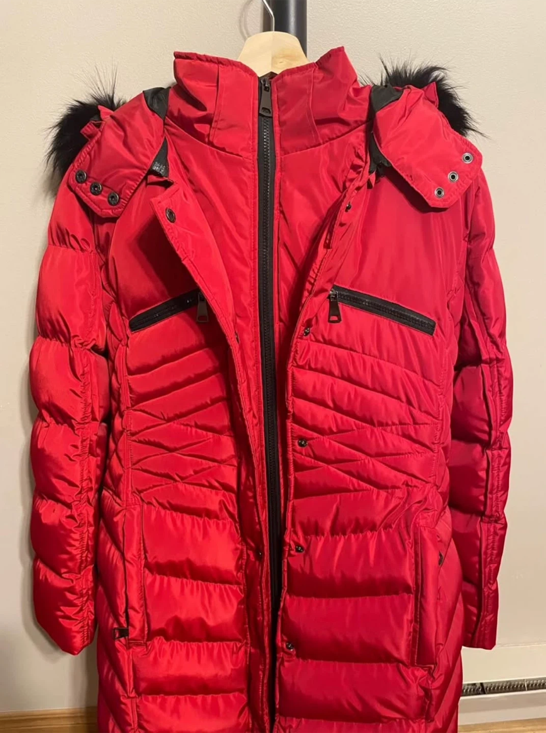 Selling a stylish red puffer coat! Coat has a full length 2 way zipper (zip front with storm flap). Faux fur and hood are detachable. Four external pockets with zipper and knit rib cuffs. Keeps you warm down to -30°C. (Only wore once - too big)