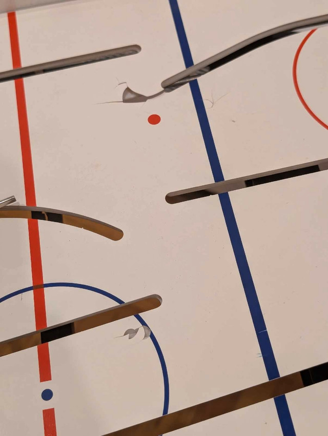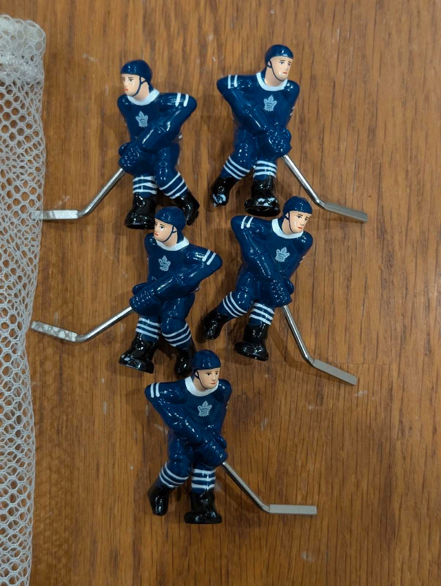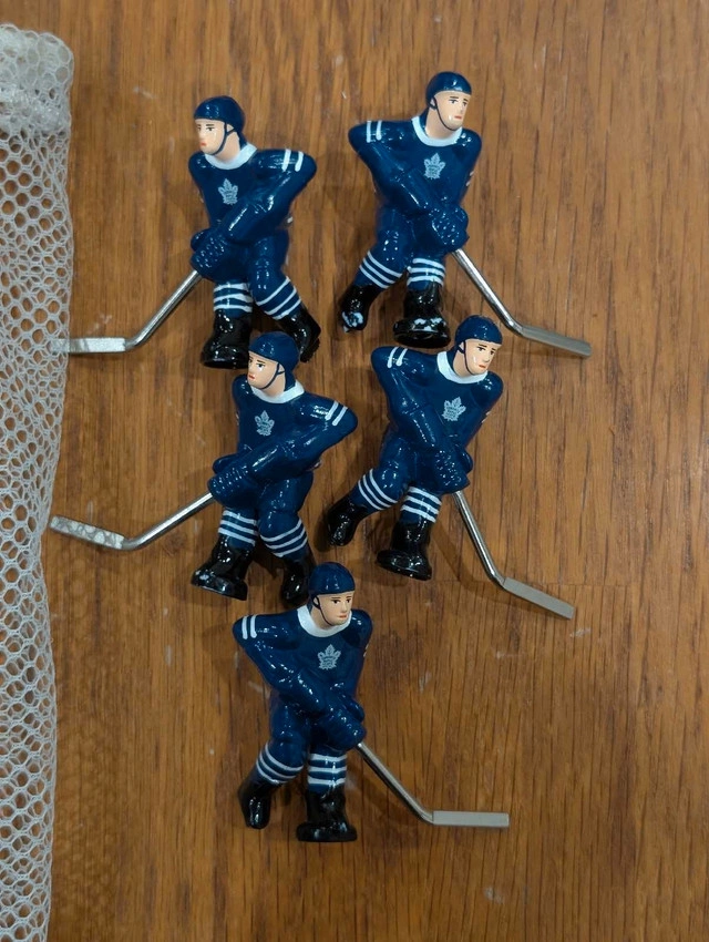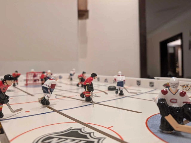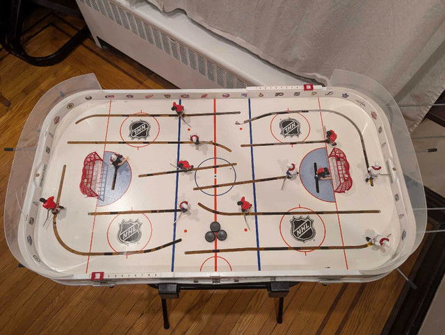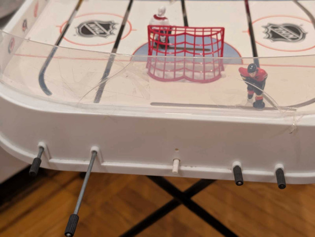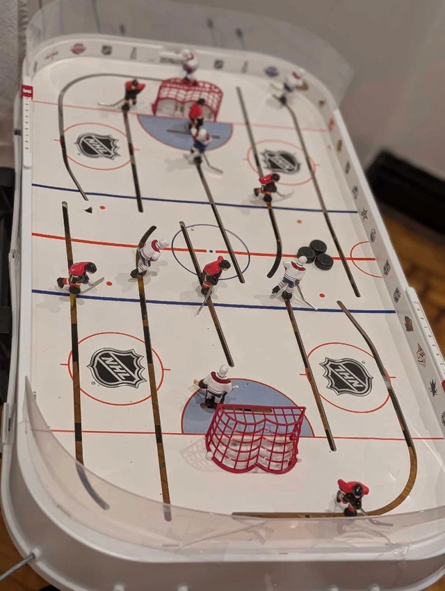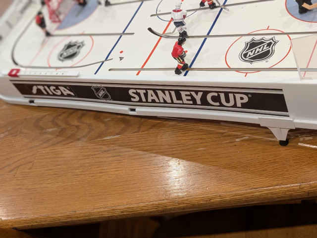 STIGA Stanley Cup table hockey game with folding stand. Features Calgary Flames, Toronto Maple Leafs, and Montreal Canadiens player figures for authentic rivalry matchups. Folding stand makes it easy to set up and store. Game is in decent condition with a couple of cracks in the rink, but still plays. Includes an extra set of players (just missing the goalie) for team variety. Classic rink with hand-painted 3D players, plexiglass shields, manual score counters, and three pucks. Perfect for collectors or casual games – ready for a new home!