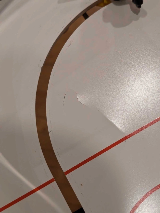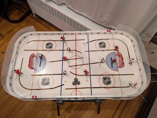 STIGA Stanley Cup table hockey game with folding stand. Features Calgary Flames, Toronto Maple Leafs, and Montreal Canadiens player figures for authentic rivalry matchups. Folding stand makes it easy to set up and store. Game is in decent condition with a couple of cracks in the rink, but still plays. Includes an extra set of players (just missing the goalie) for team variety. Classic rink with hand-painted 3D players, plexiglass shields, manual score counters, and three pucks. Perfect for collectors or casual games – ready for a new home!