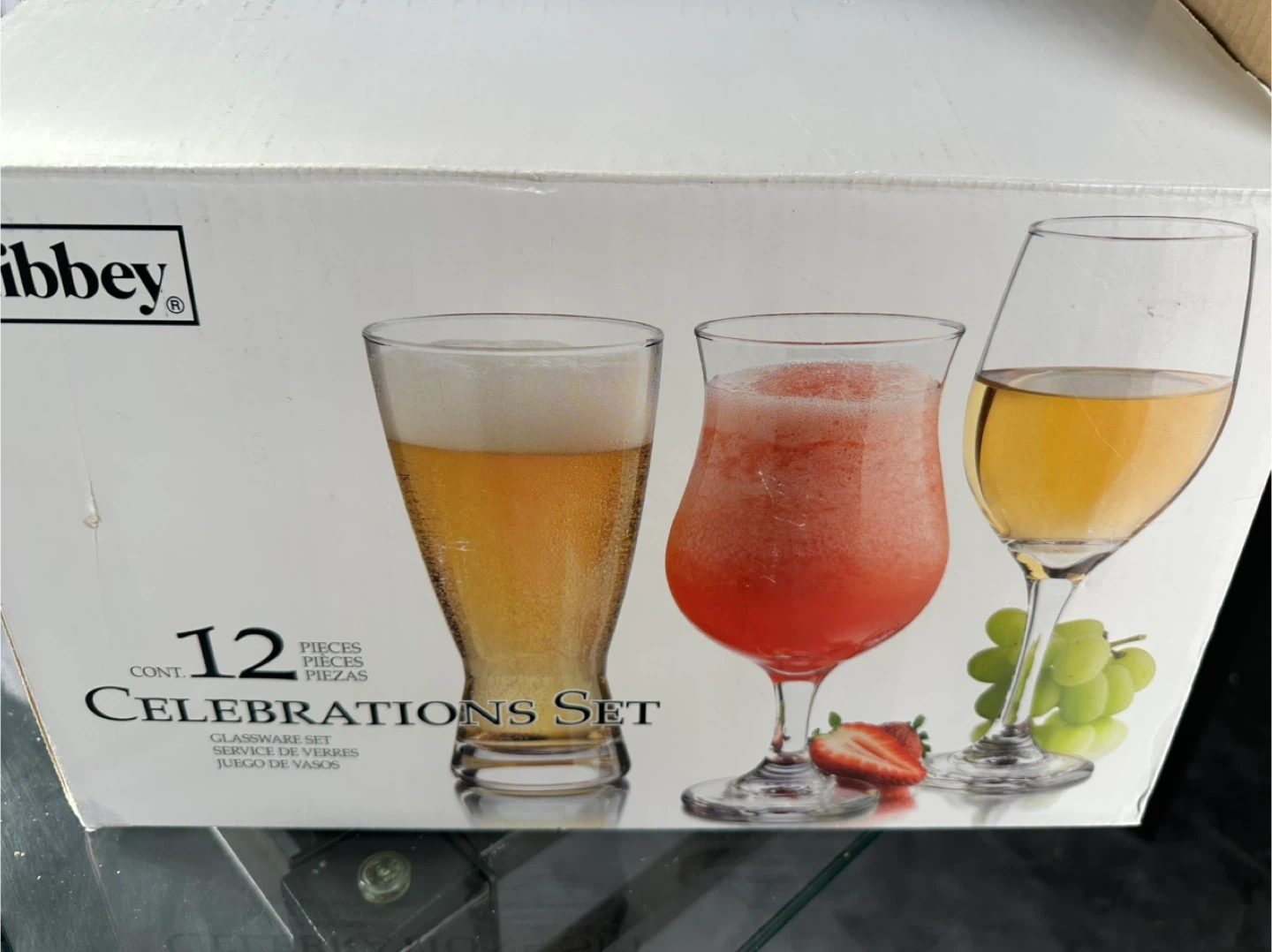 Selling a Libbey Celebrations 12-piece glassware set! The set includes 4 pilsners (15 oz/444 ml), 4 wine glasses (11 oz/325 ml), and 4 cocktail glasses (13 oz/384 ml). Great for entertaining or everyday use! The box is included.