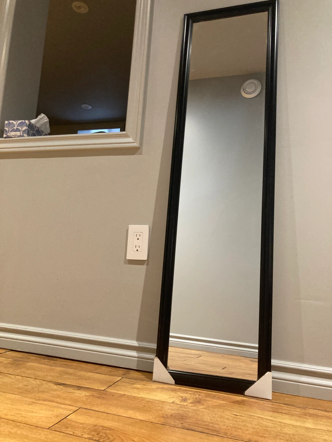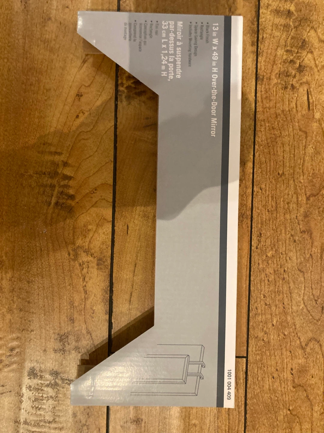 Selling a full-length over-the-door mirror with a sleek black finish. The mirror measures 13 inches wide by 49 inches high (33 cm x 1.24 m). It's in great condition and ready to hang. Installation instructions are included on the box