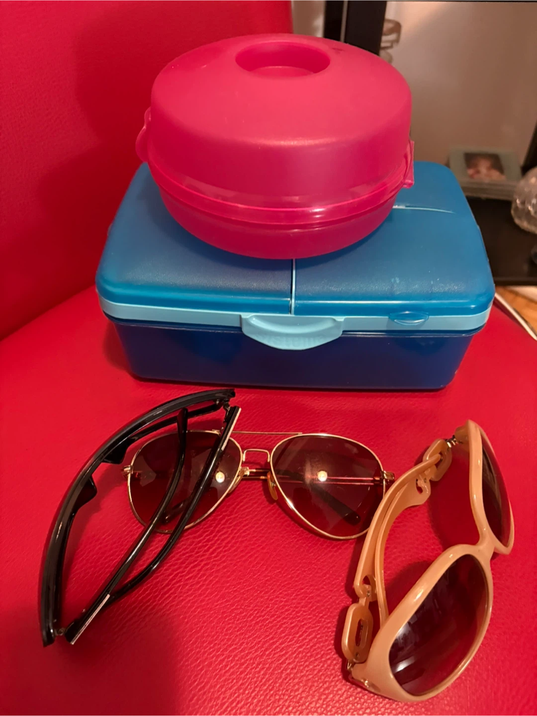 Free a couple of pairs of sunglasses and a lunch box. The sunglasses show some wear, and one pair is missing a piece. The lunch box is blue with a pink top.