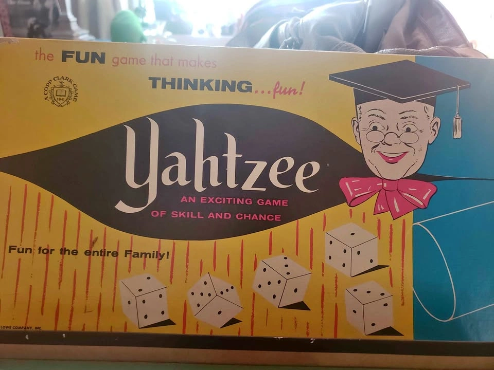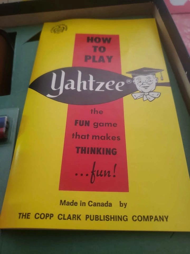 1956 Yahtzee - An Exciting Game of Skill and Chance! Made in Canada by Copp Clark Publishing. There is some wear on the bottom of the outer box due to age and storage but the game itself looks totally unused. The pencils and dice are still sealed and there are no marks at all on the score pad. Pick up in Upper Lonsdale North Vancouver
