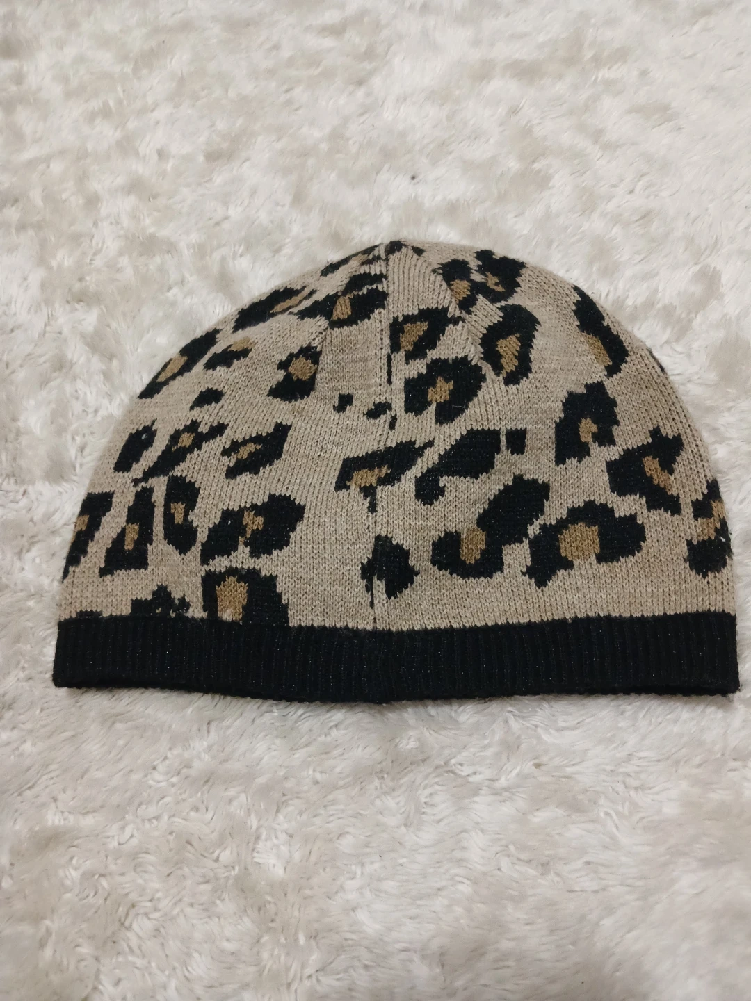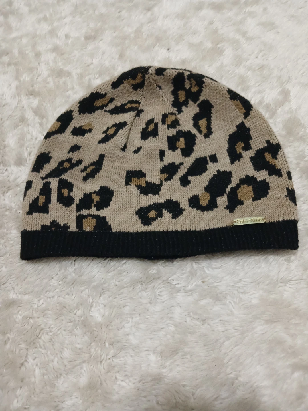 Cozy up with this stylish Calvin Klein beanie! It features a fun leopard print design in neutral tones, perfect for adding a touch of flair to your winter outfits. The beanie is in great condition and ready to keep you warm all season long