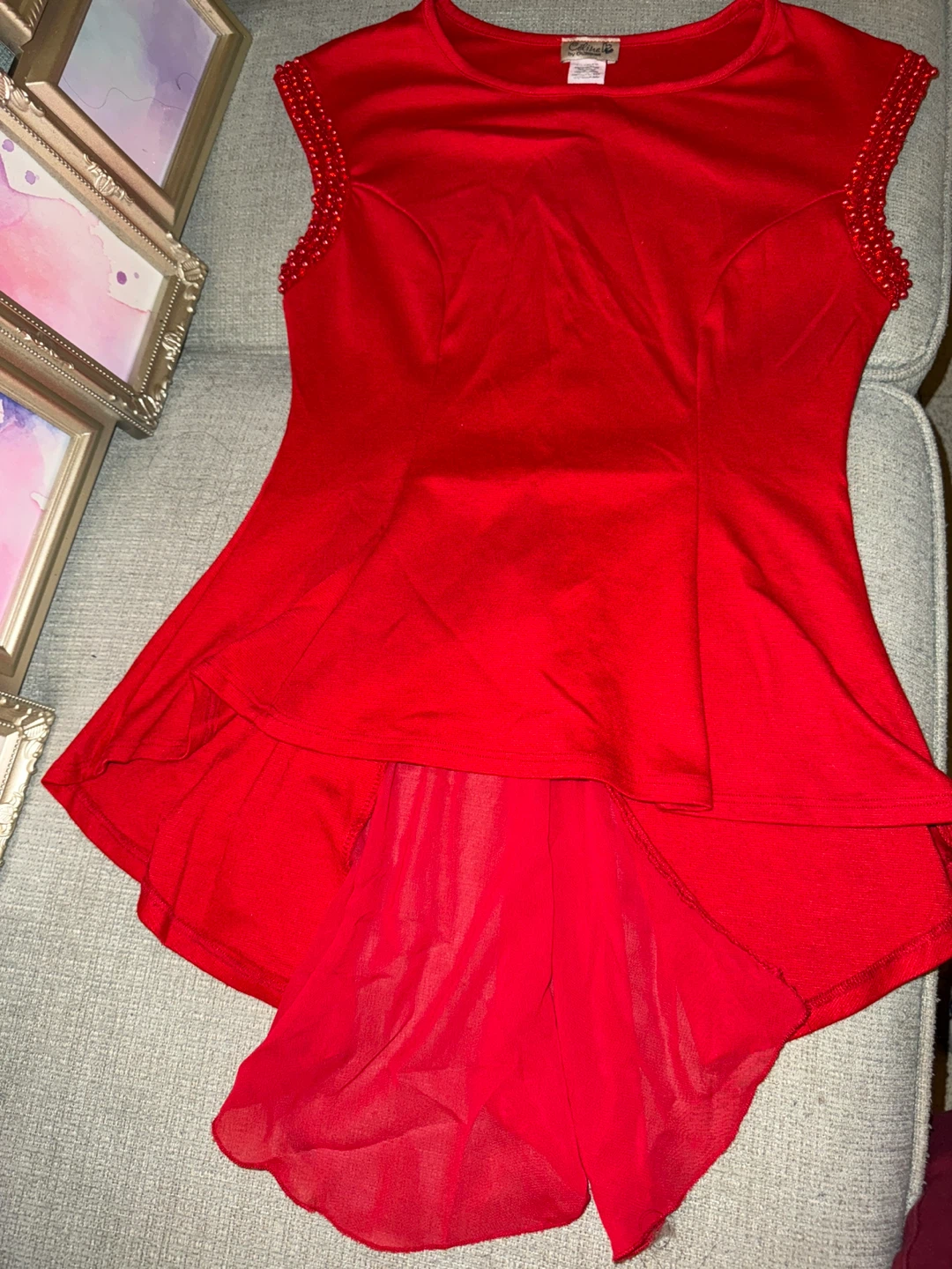 Selling a vibrant red shirt by Celine by Champion! This dress is a size medium and features a unique design with beaded embellishments on the shoulders. The dress is made of 89% polyester, 7% rayon, and 4% spandex for a comfortable and flattering fit