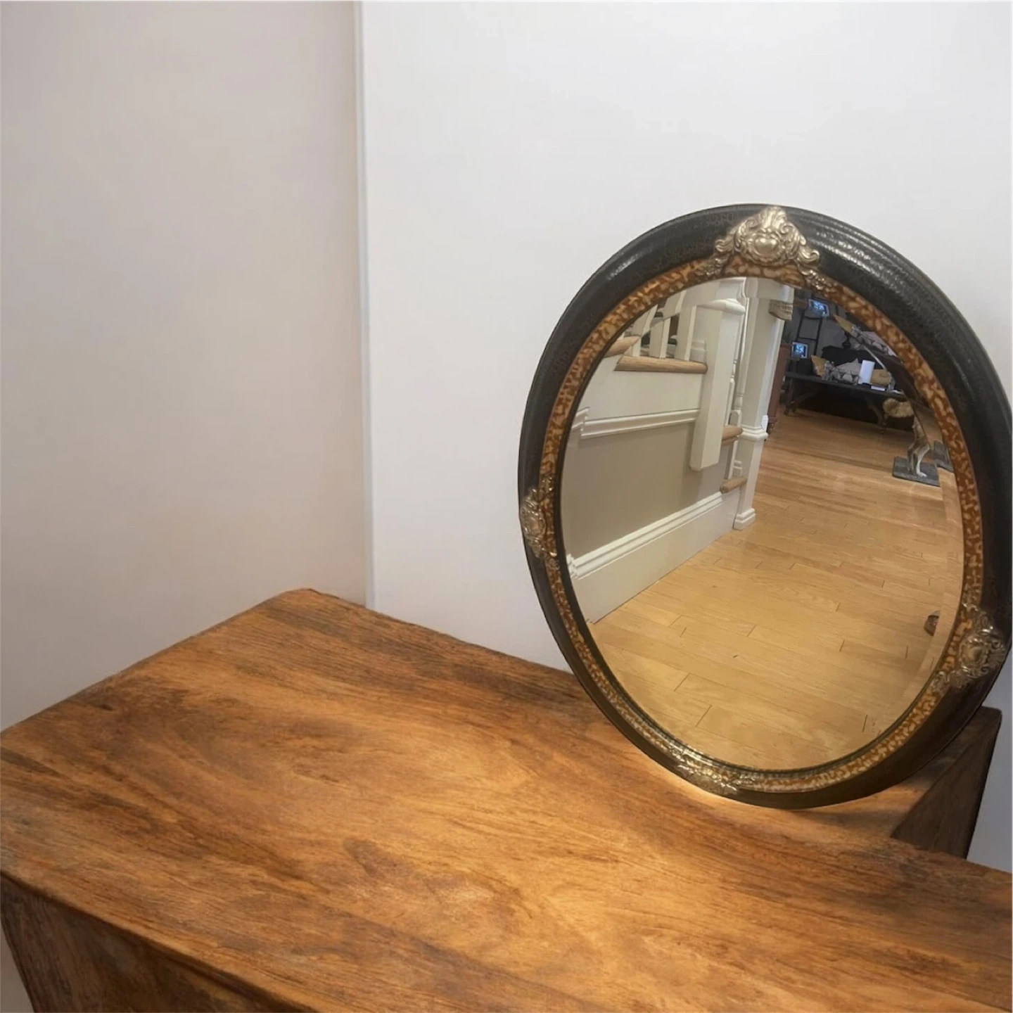 Ornate Faux Suede Lizard Look Beveled oval mirror. 32.5 x 26 inches. Measured from the back it's almost 26.5 inches across. Excellent pre-owned condition . Pick up only.