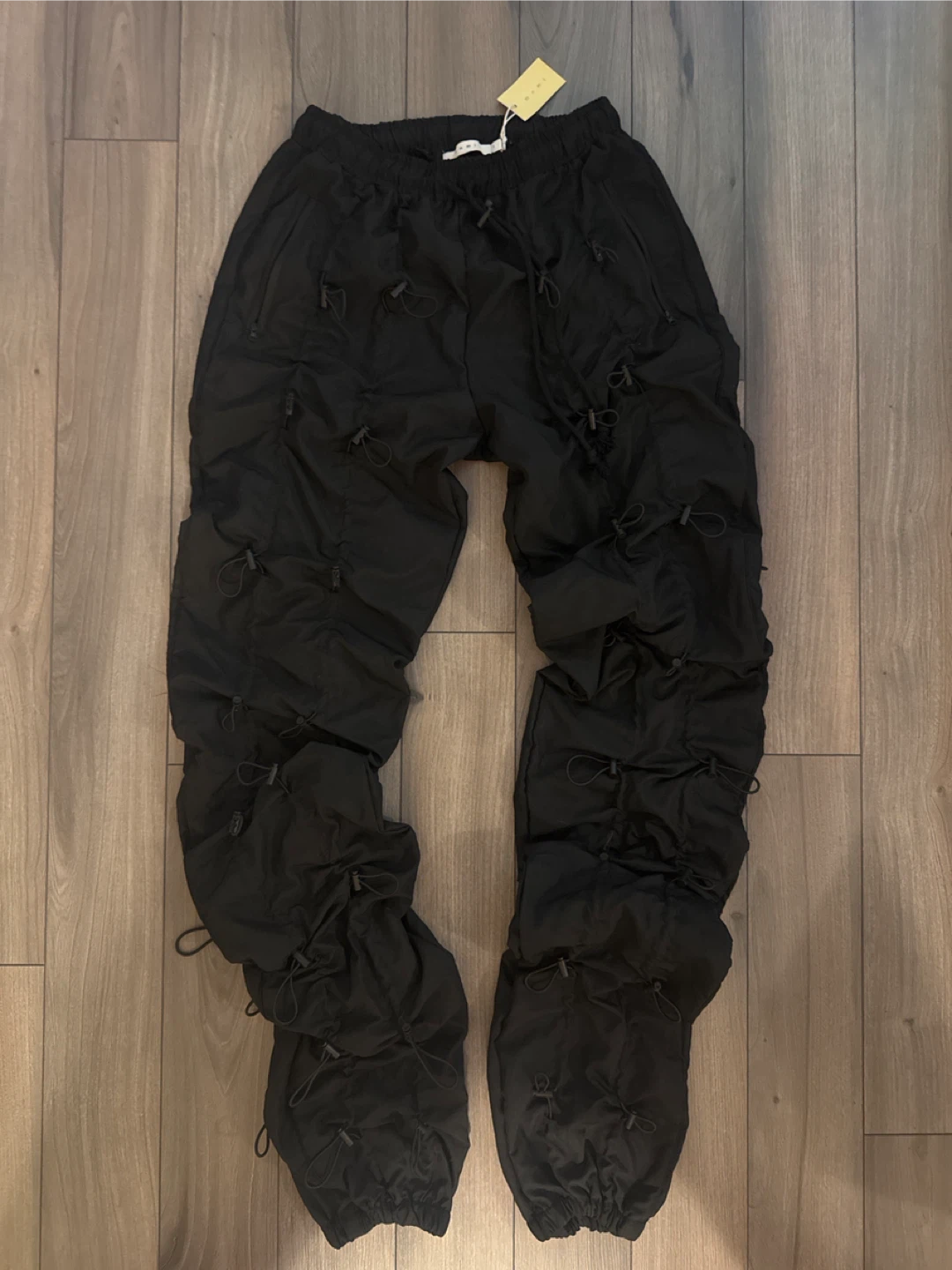 Selling a pair of mnml Bungee Cord Pants in black, size large. These pants have a unique design with bungee cord detailing throughout. They can be stacked and worn as a statement piece for a streetwear look or for a rave/party. They are brand new, with tags and ready for a new home!