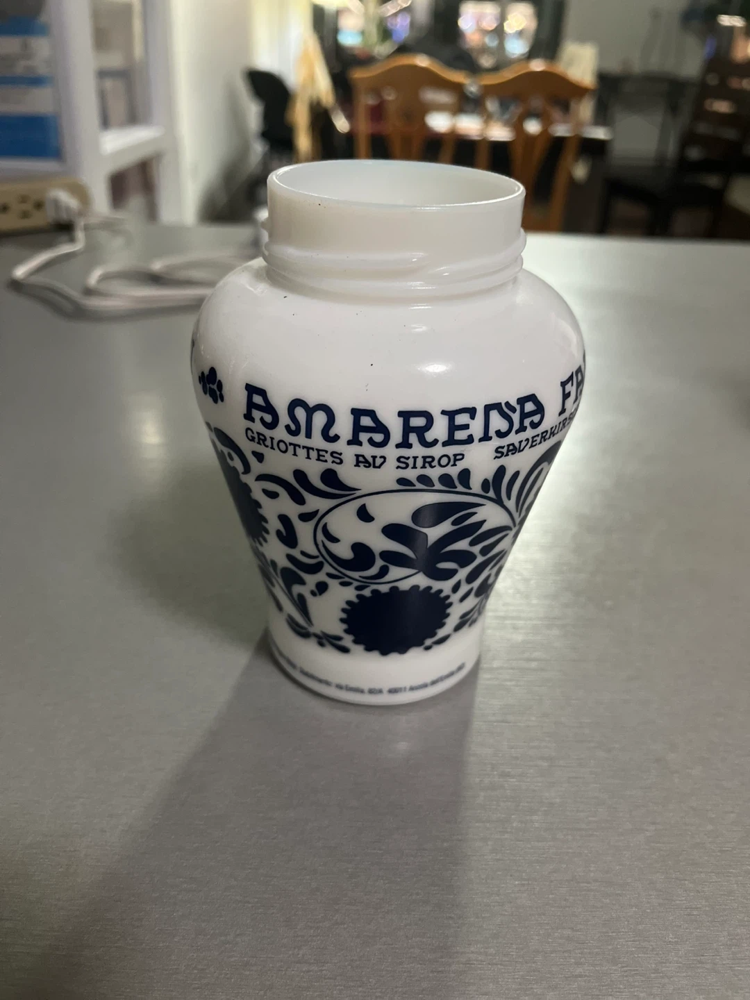 Giving away a beautiful Amarena Fabbri Griottes Au Sirop jar! It features a lovely blue floral design on a white background. Perfect for adding a touch of elegance to your kitchen or as a decorative piece