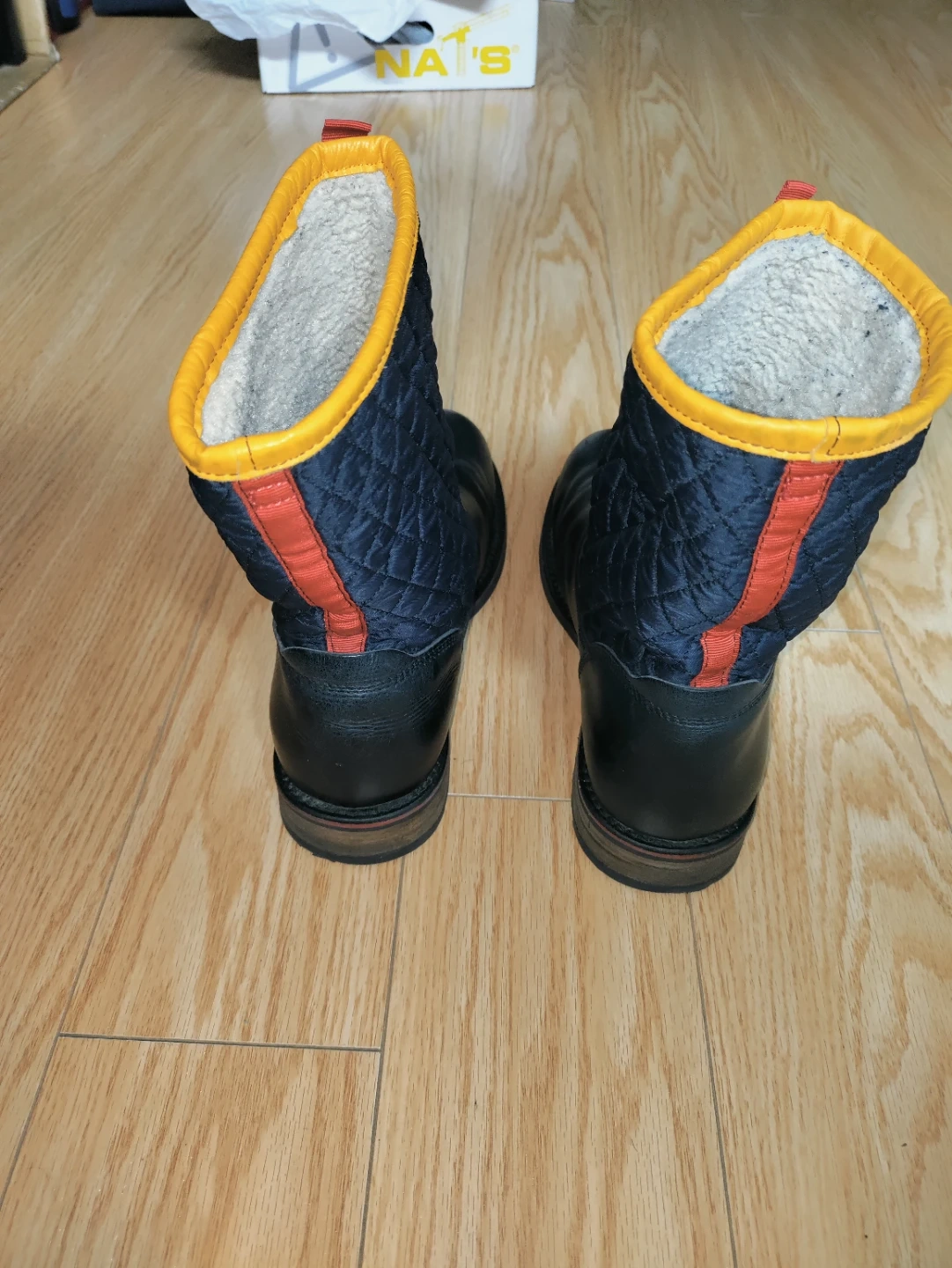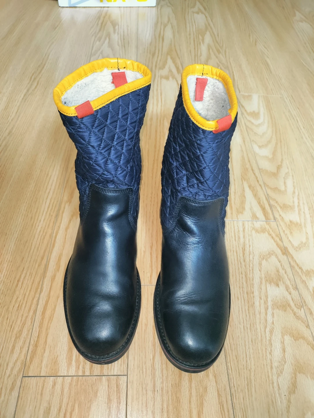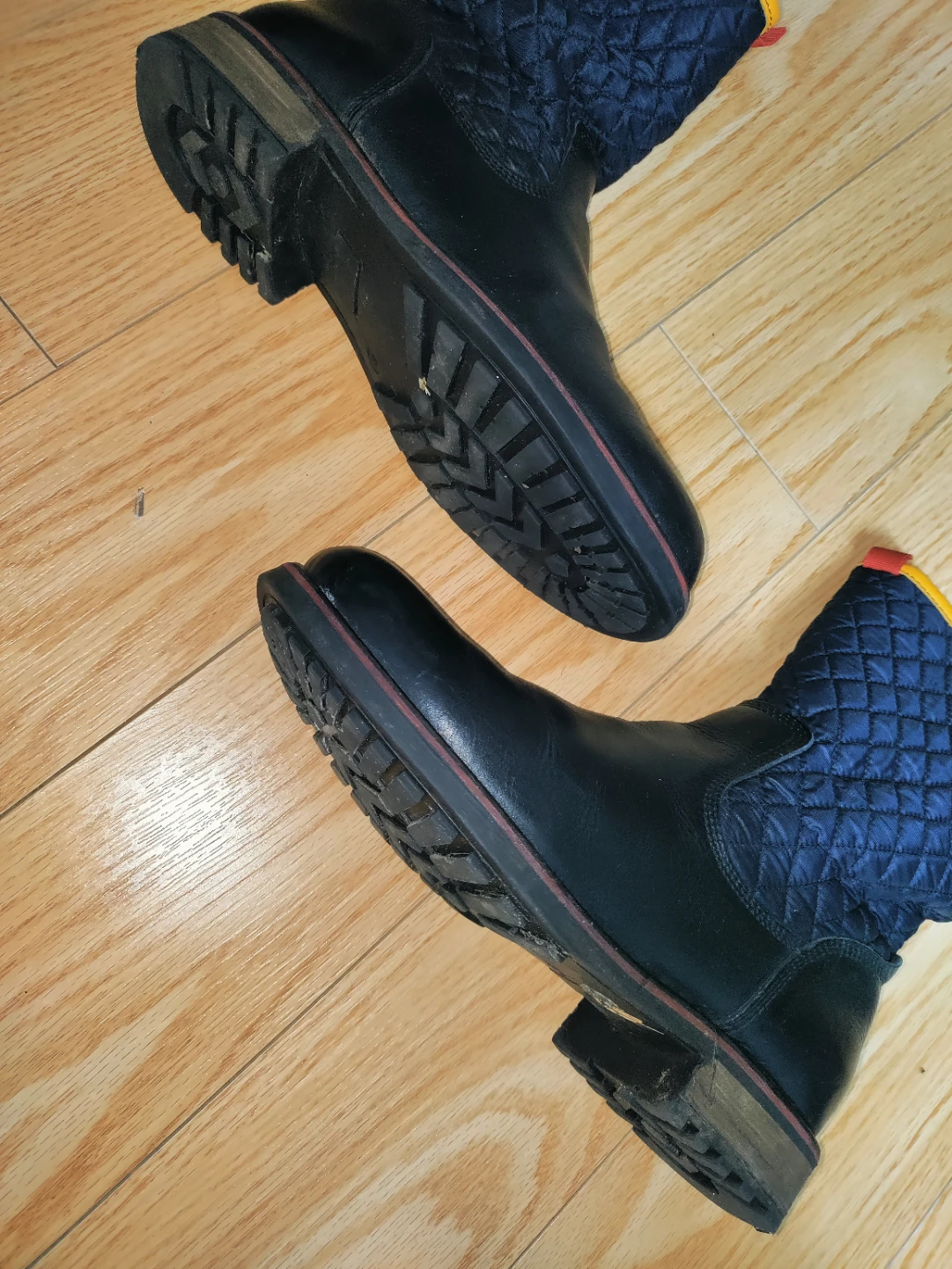 These boots feature a black leather foot and a quilted blue upper. They have a cozy lining and a sturdy sole. They're in good condition and ready for some Canadian weather!