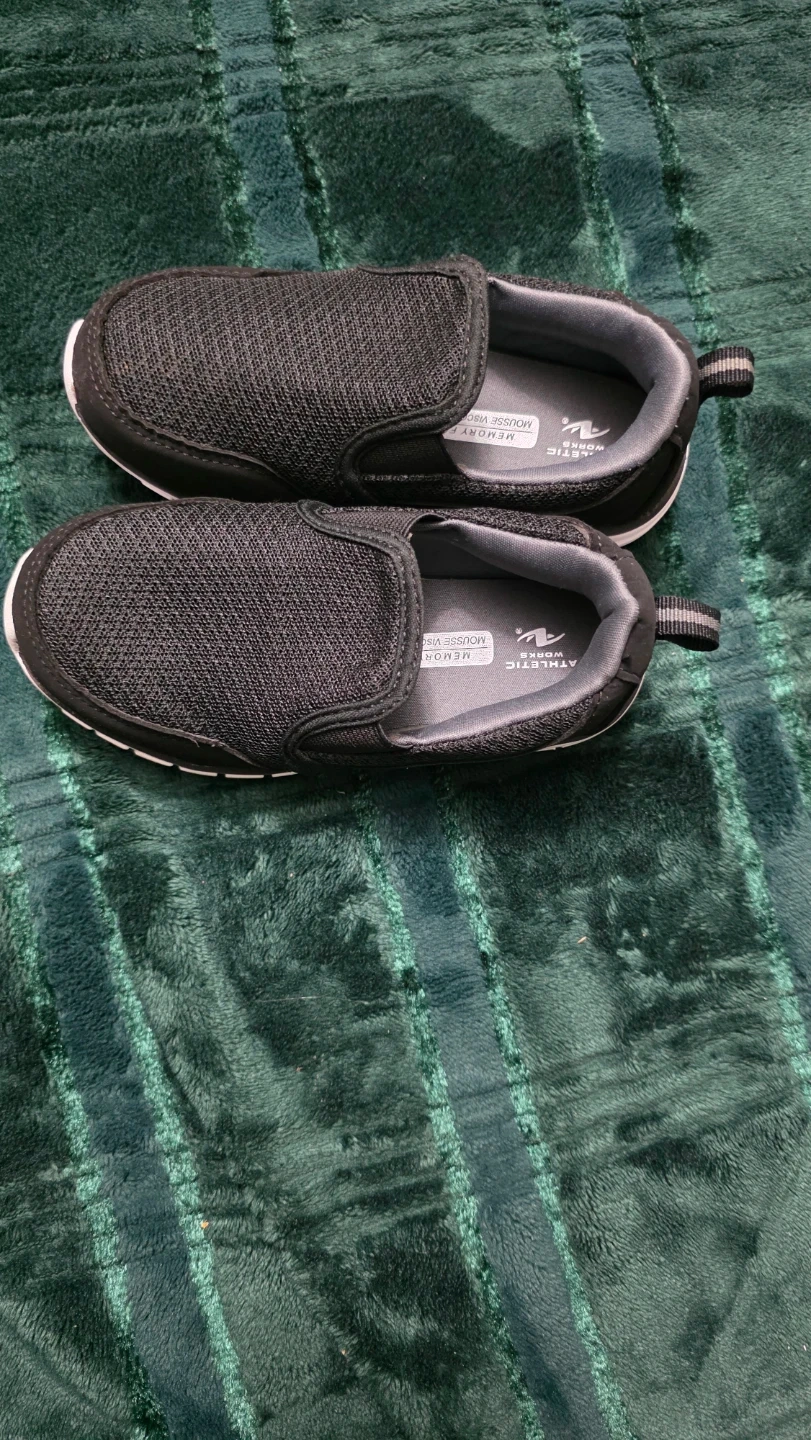 Selling a pair of Athletic Works black slip-on shoes in size 11. They feature memory foam insoles for extra comfort. Great for everyday wear!