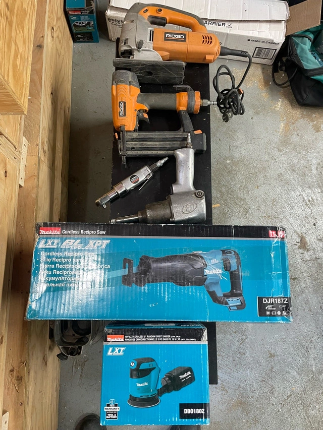 * Brand New Makita Brushless Cordless Reciprocating Saw $260 * Brand New Makita Cordless Orbital Sander $155 * Ridgid Corded Jigsaw $70 * Rigid Nail gun $70 * Pneumatic 1/4” drive ratchet $20 * Pneumatic 1/2” impact wrench $40 Just a heads up, if you're seeing this ad, the tools are still up for grabs!