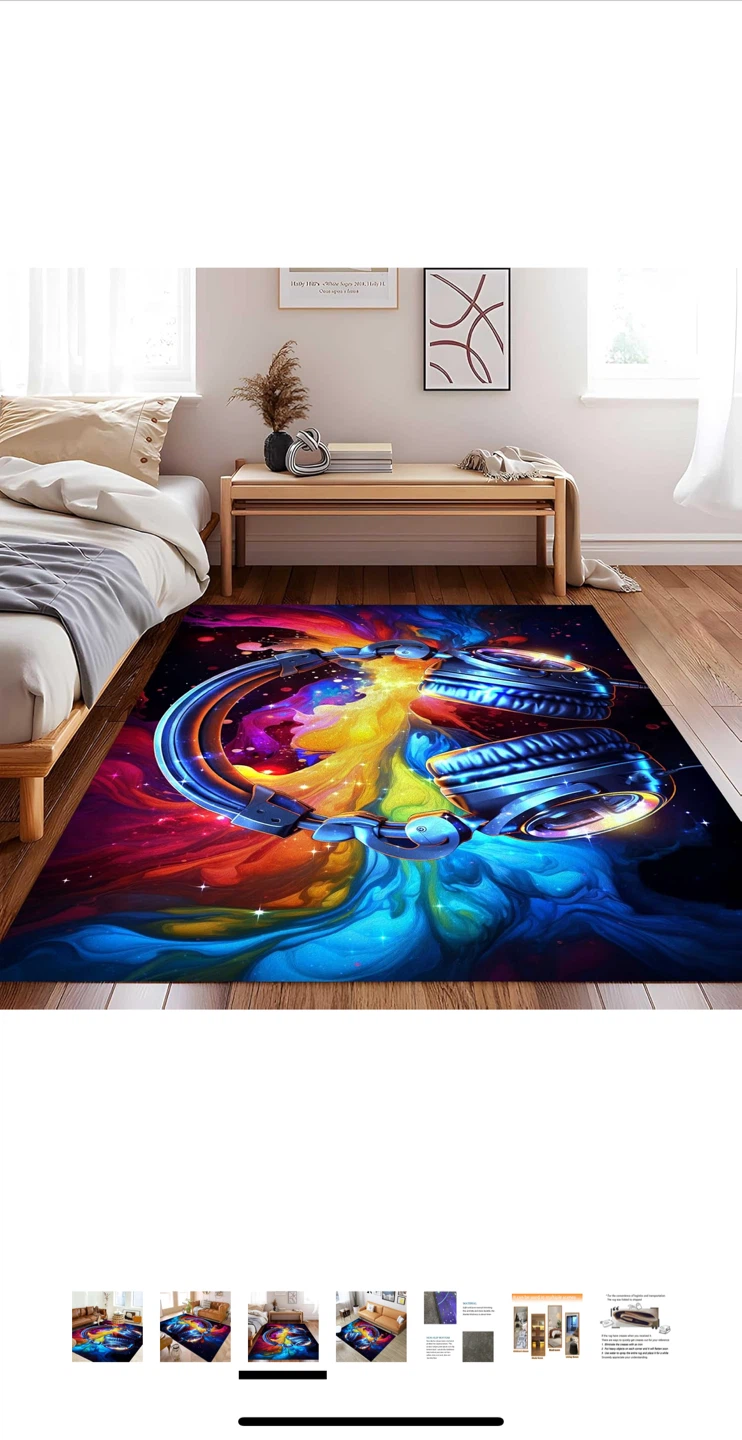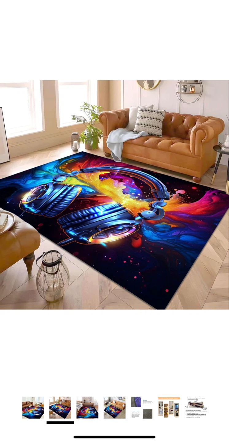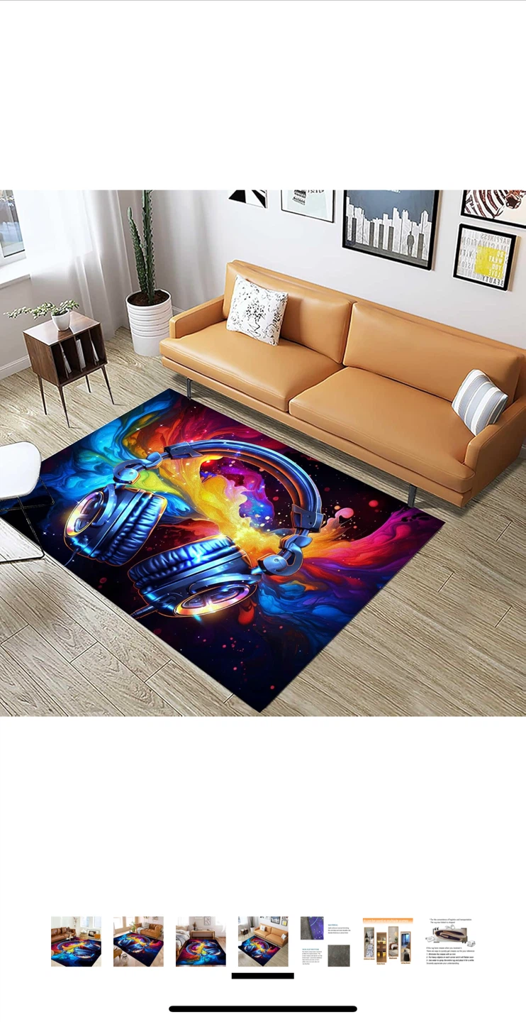 This area rug features a vibrant headphones design, perfect for adding a splash of colour to any room. It has a non-slip bottom and is about 6mm thick for comfort and durability. The material is light and pure manual trimming, fine and tidy and more durable