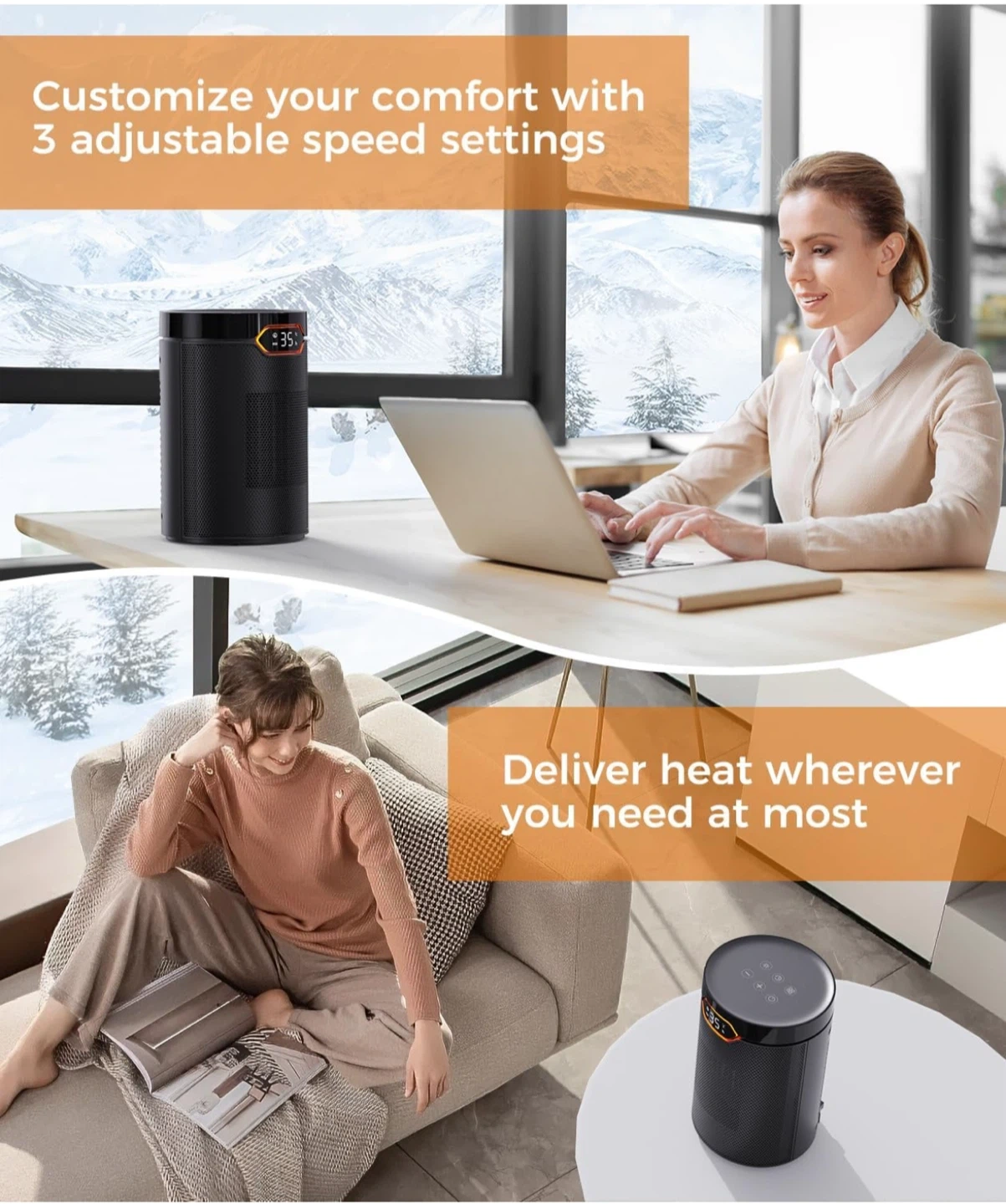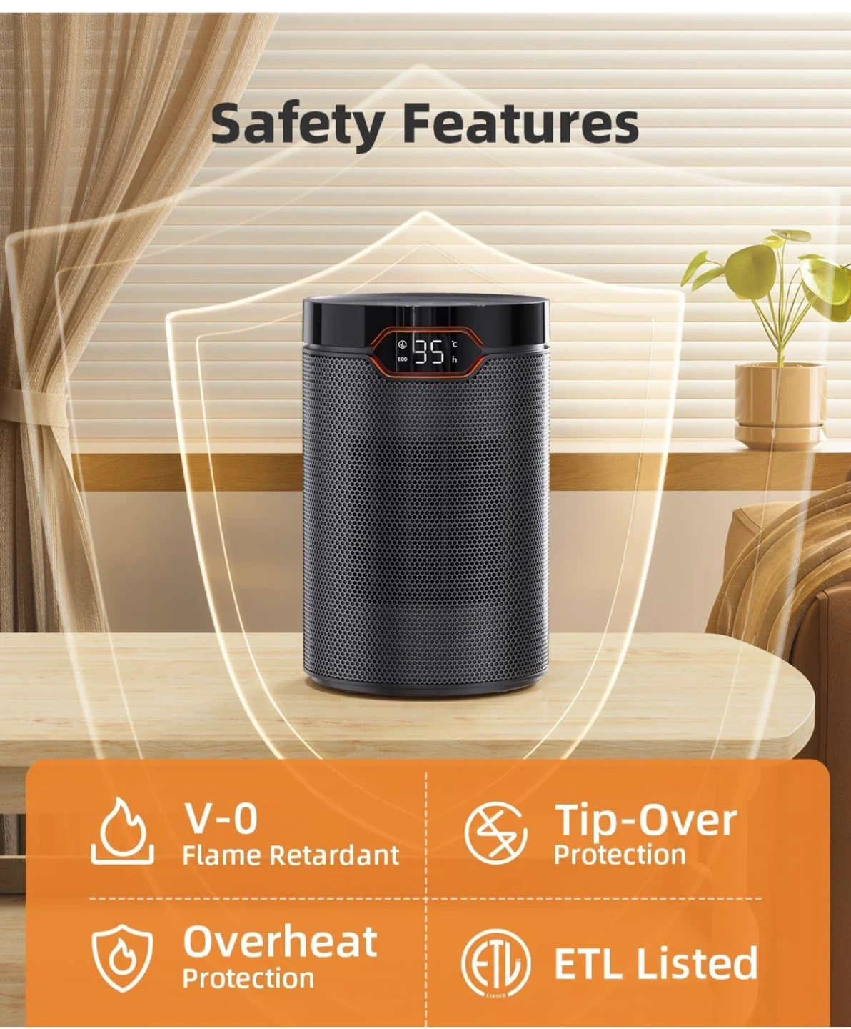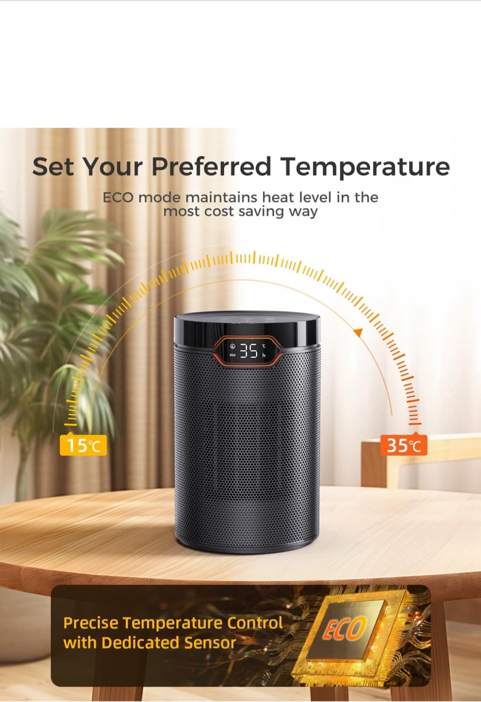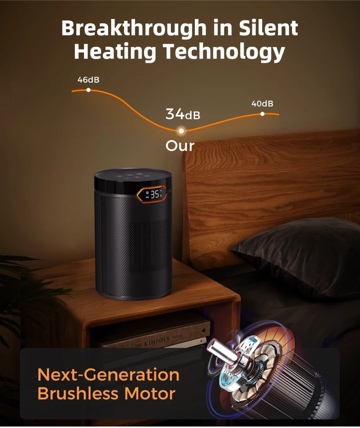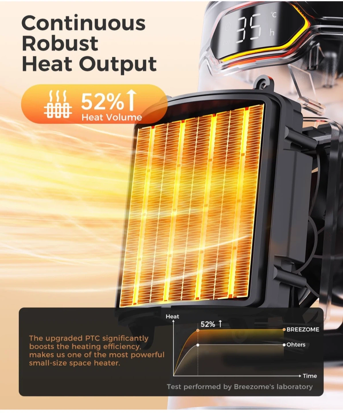 This Breezome space heater features breakthrough silent heating technology and a next-generation brushless motor. It also has safety features like V-0 flame retardant material and tip-over protection. It provides continuous robust heat output with precise temperature control using a dedicated sensor. ECO mode maintains heat level in the most cost-saving way