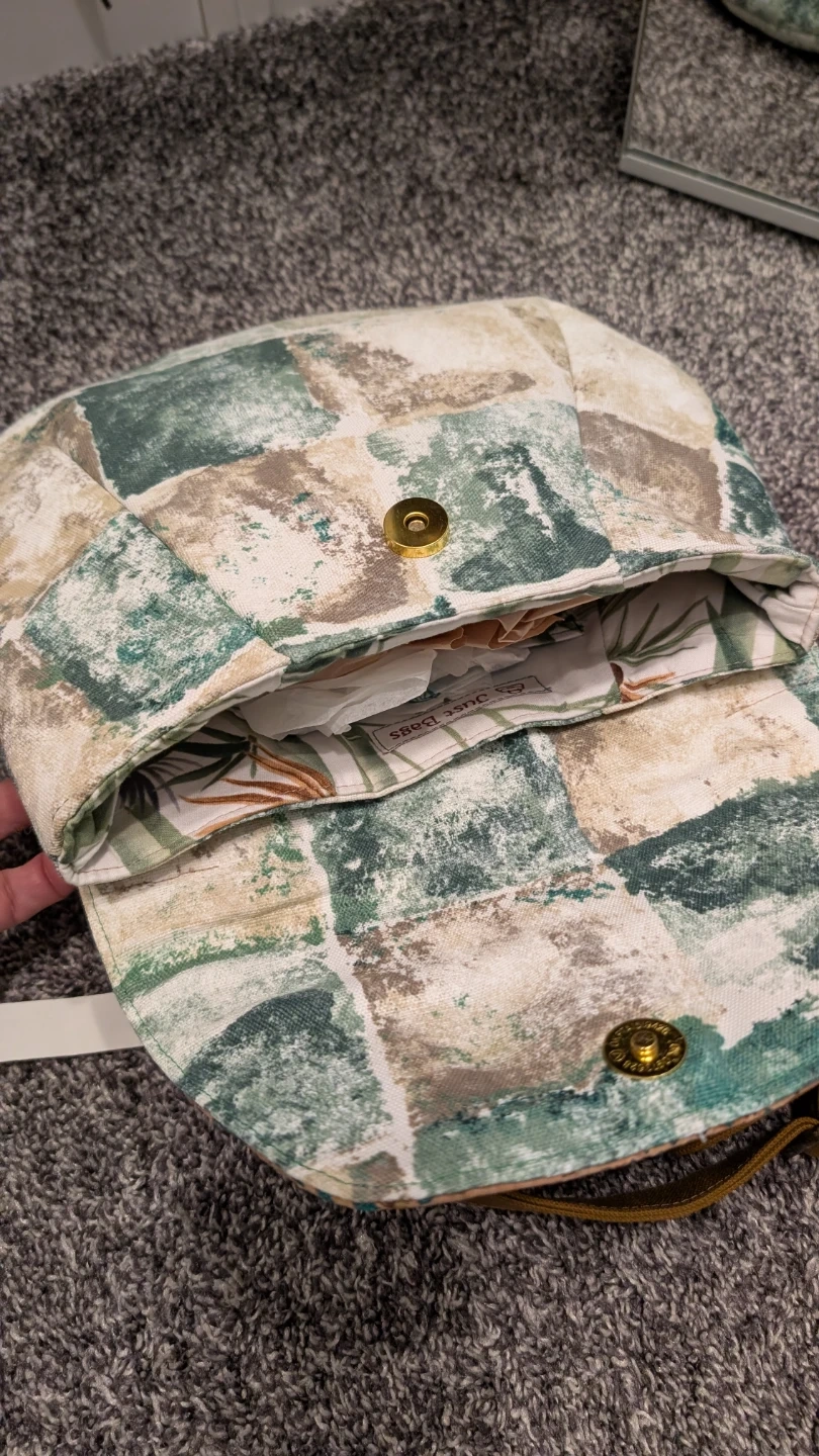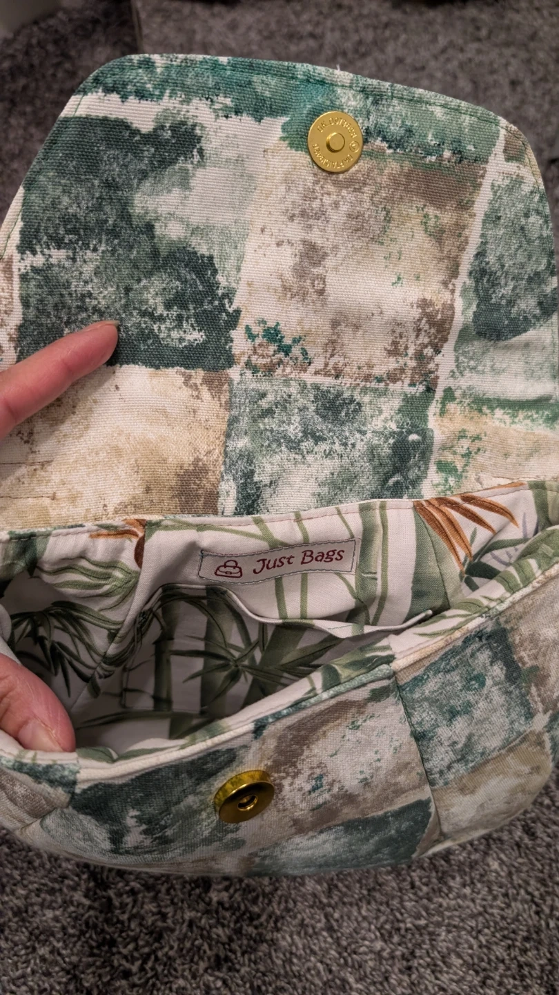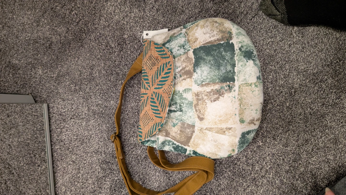 Selling a cute crossbody purse from Just Bags! It features a unique patchwork design in earthy tones and a leafy interior pattern. The strap is adjustable for comfortable wear