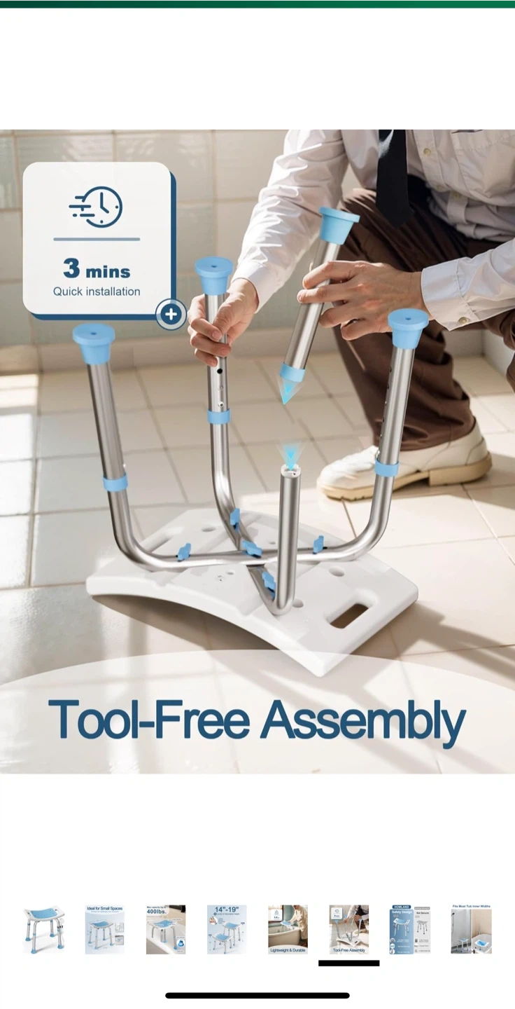 This bath and shower chair is perfect for small spaces. It's lightweight and durable, and the height is adjustable from 14" to 19". It can hold up to 400lbs, and the recommended user weight is 300lbs. It also has in-seat handles, an anti-slip pad, drain holes, and non-slip feet