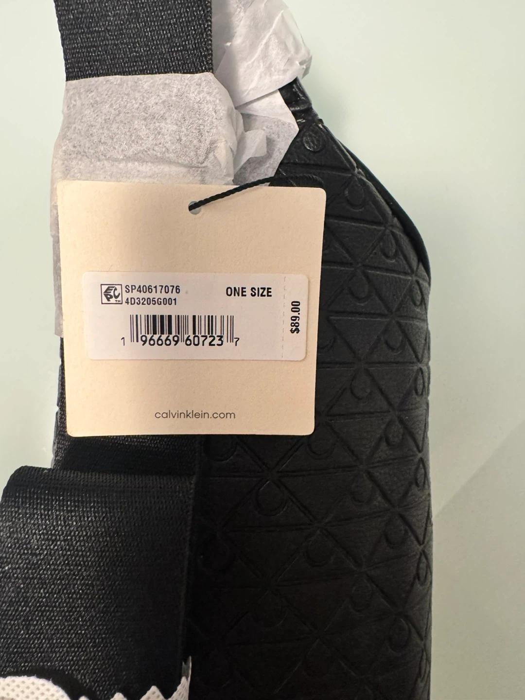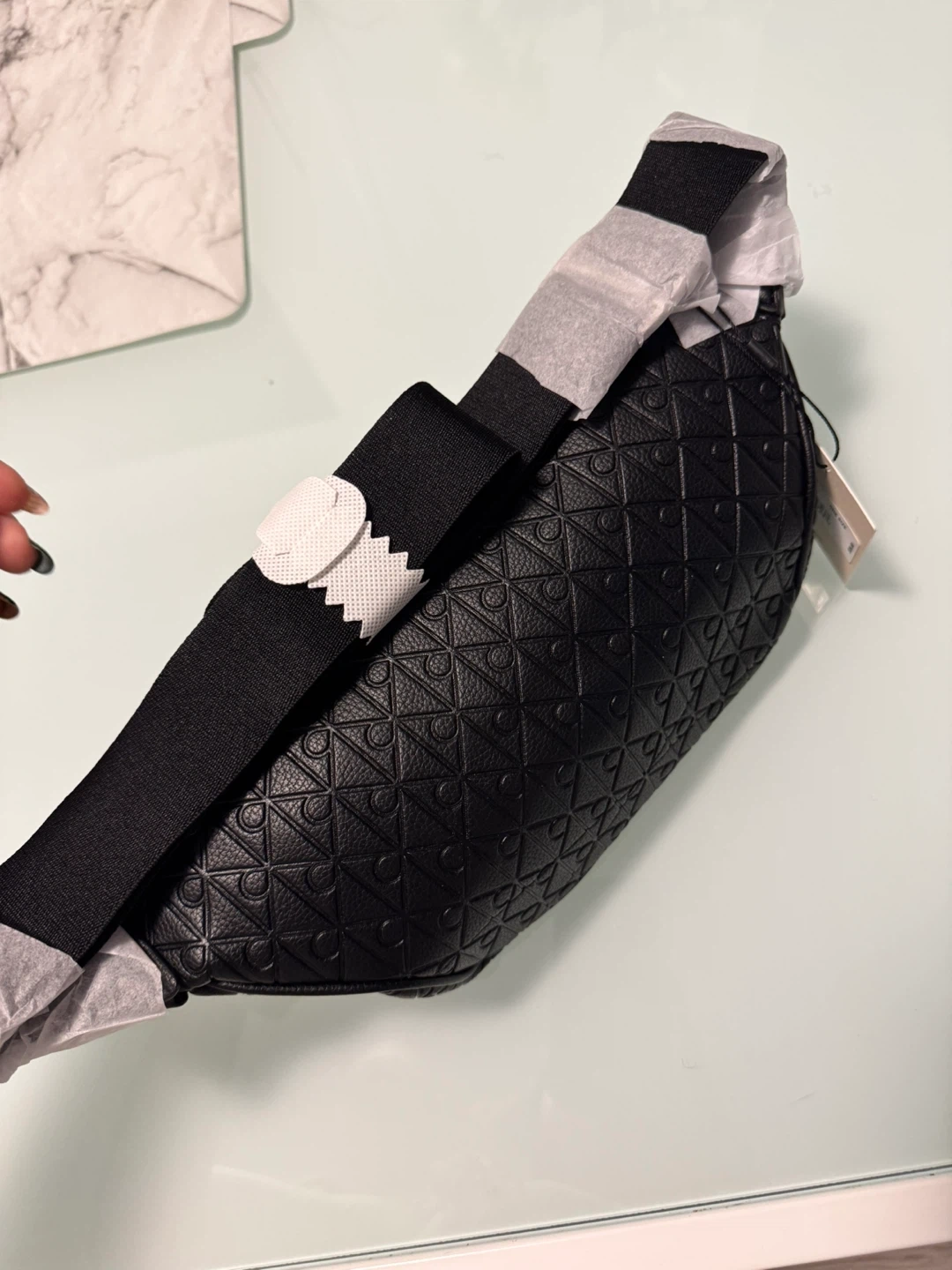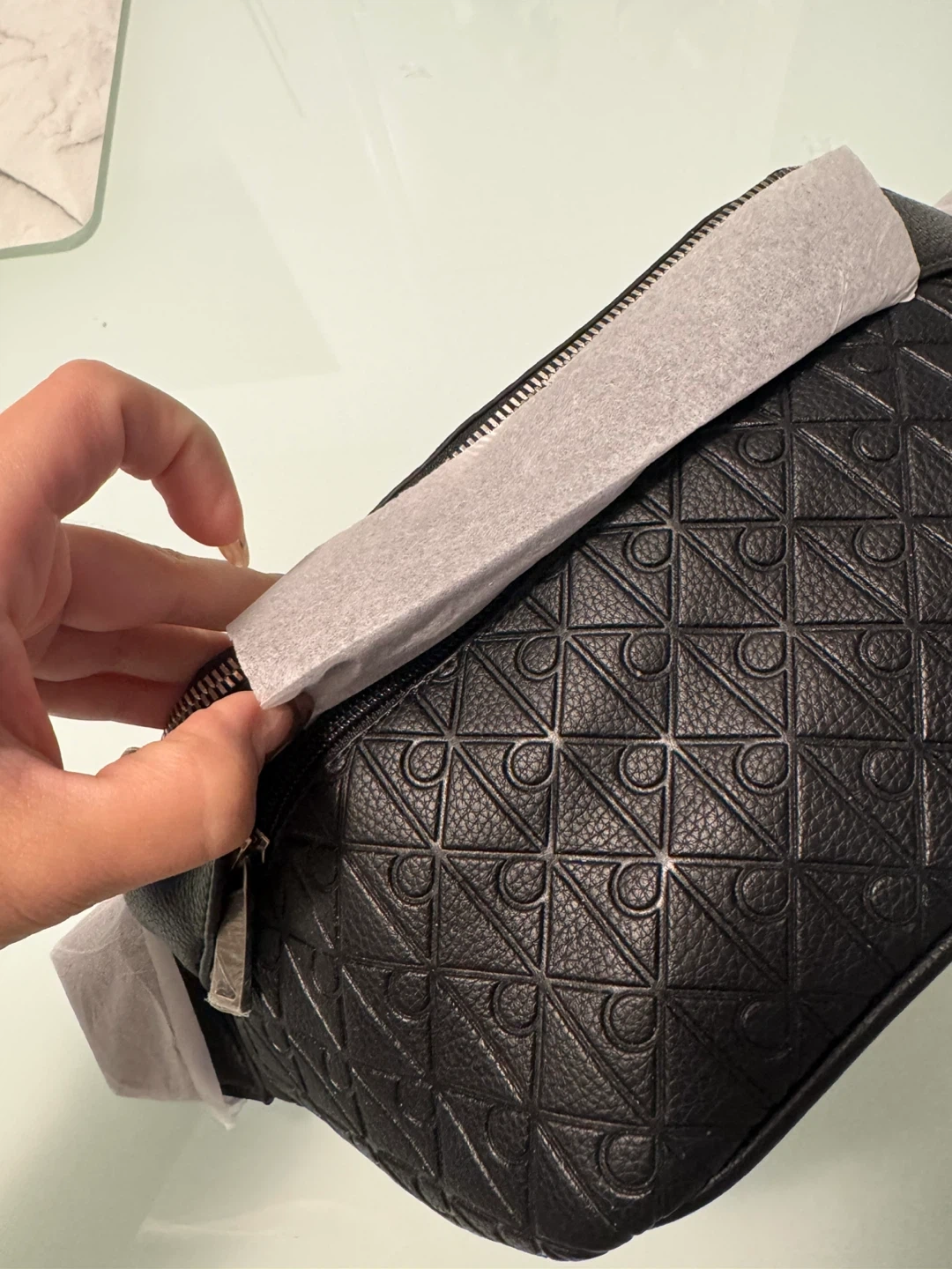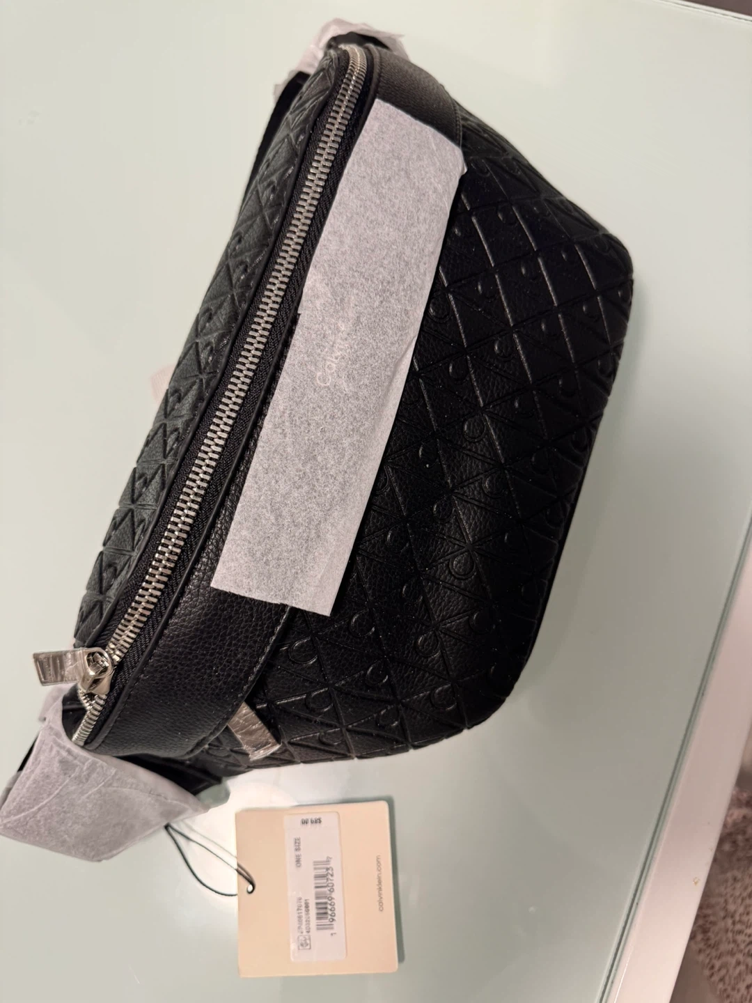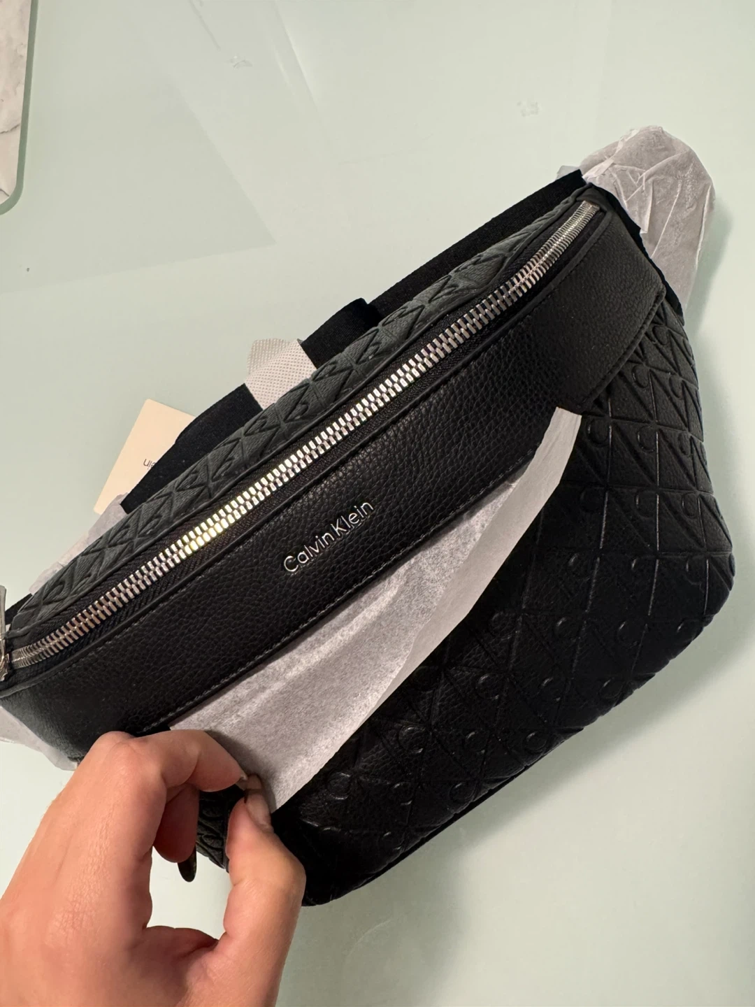 This is a black Calvin Klein belt bag with an all-over embossed pattern. It features a zippered main compartment and an adjustable strap. The bag is made of faux leather. Brand new. No use.