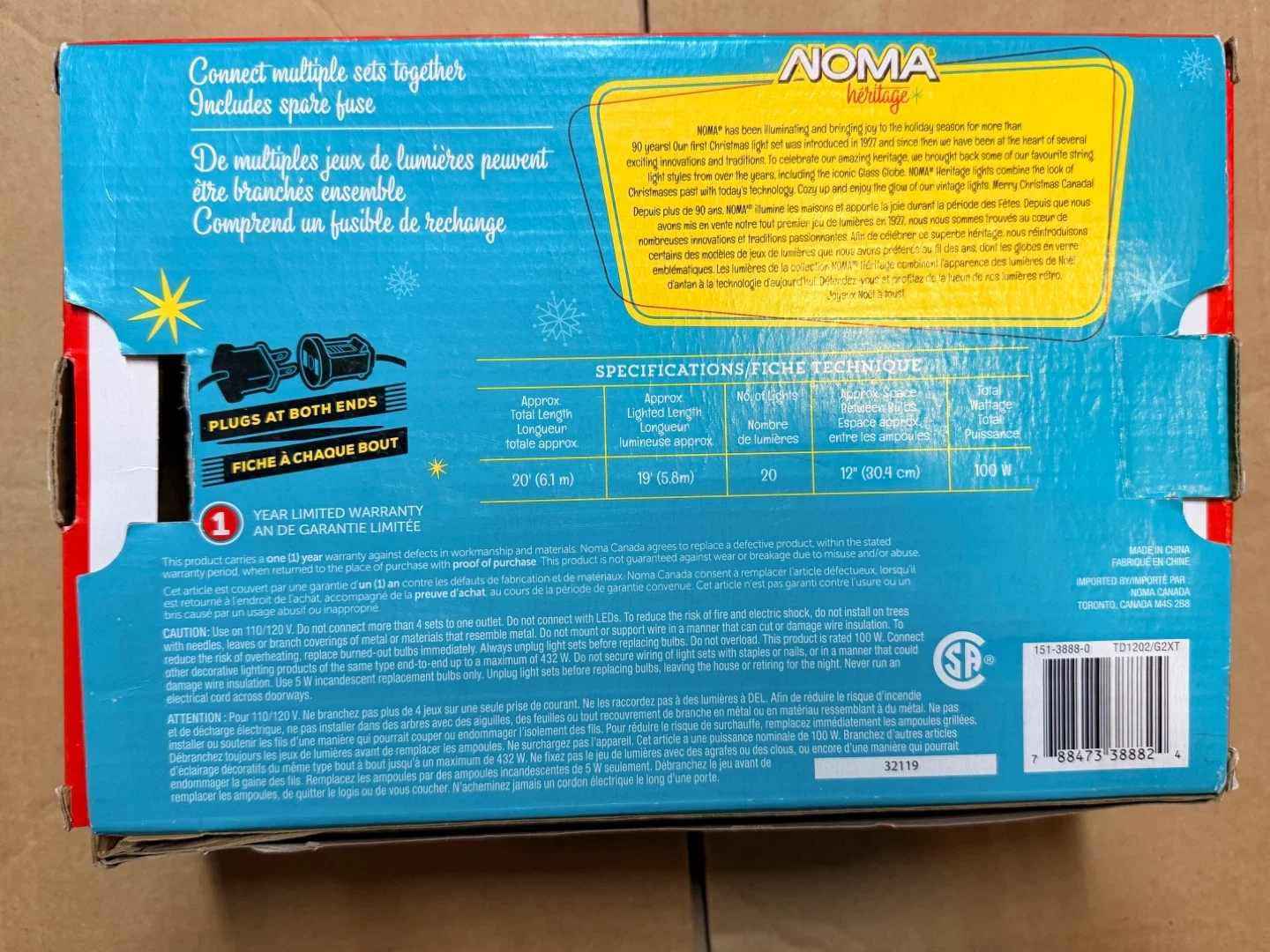 Get ready to light up your space with these Noma Heritage Glass Globe String Lights! This set includes 20 multi-coloured lights perfect for indoor or outdoor use.m. The approximate total length is 20' (6.1 m). Selling 3 units of $5 each