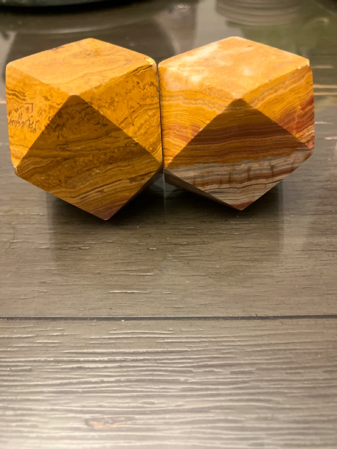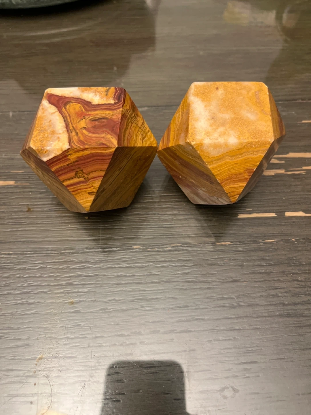 Selling two unique decorative stone dodecahedrons. They feature beautiful layers of color and are in great condition. Perfect for adding a touch of natural elegance to your home decor