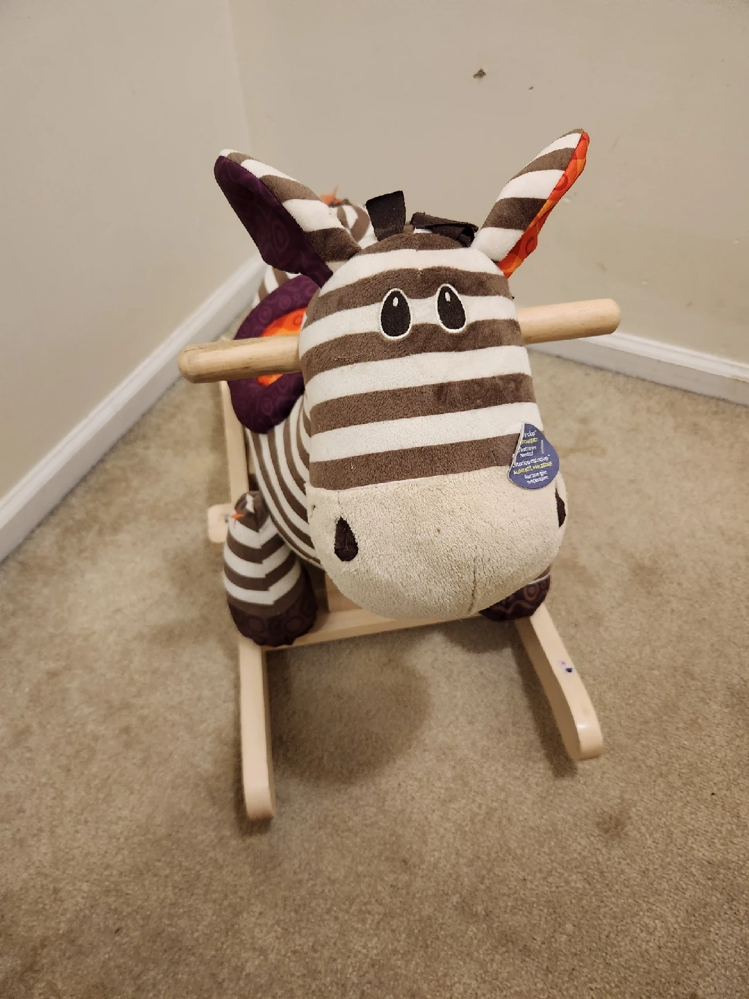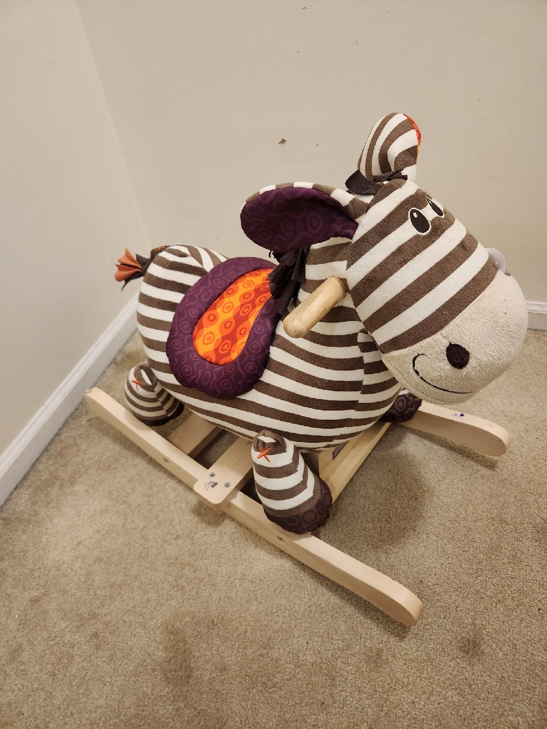 This adorable zebra rocking horse by B. toys is ready for a new home! Aside from a few small stickers on the bottom it's in great condition and has a comfy saddle for your little one to ride on. Perfect for toddlers and young children who love to rock and play