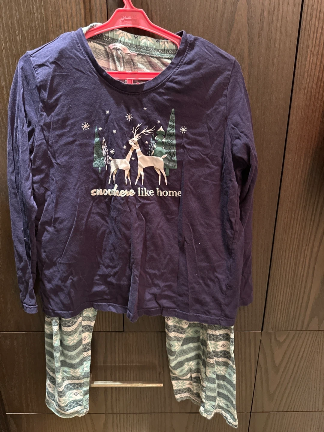 Cute La Vie en Rose pajama set in size medium! The top is a navy blue with a wintery deer and tree design, and the bottoms are a patterned green and white. Perfect for cozy nights!