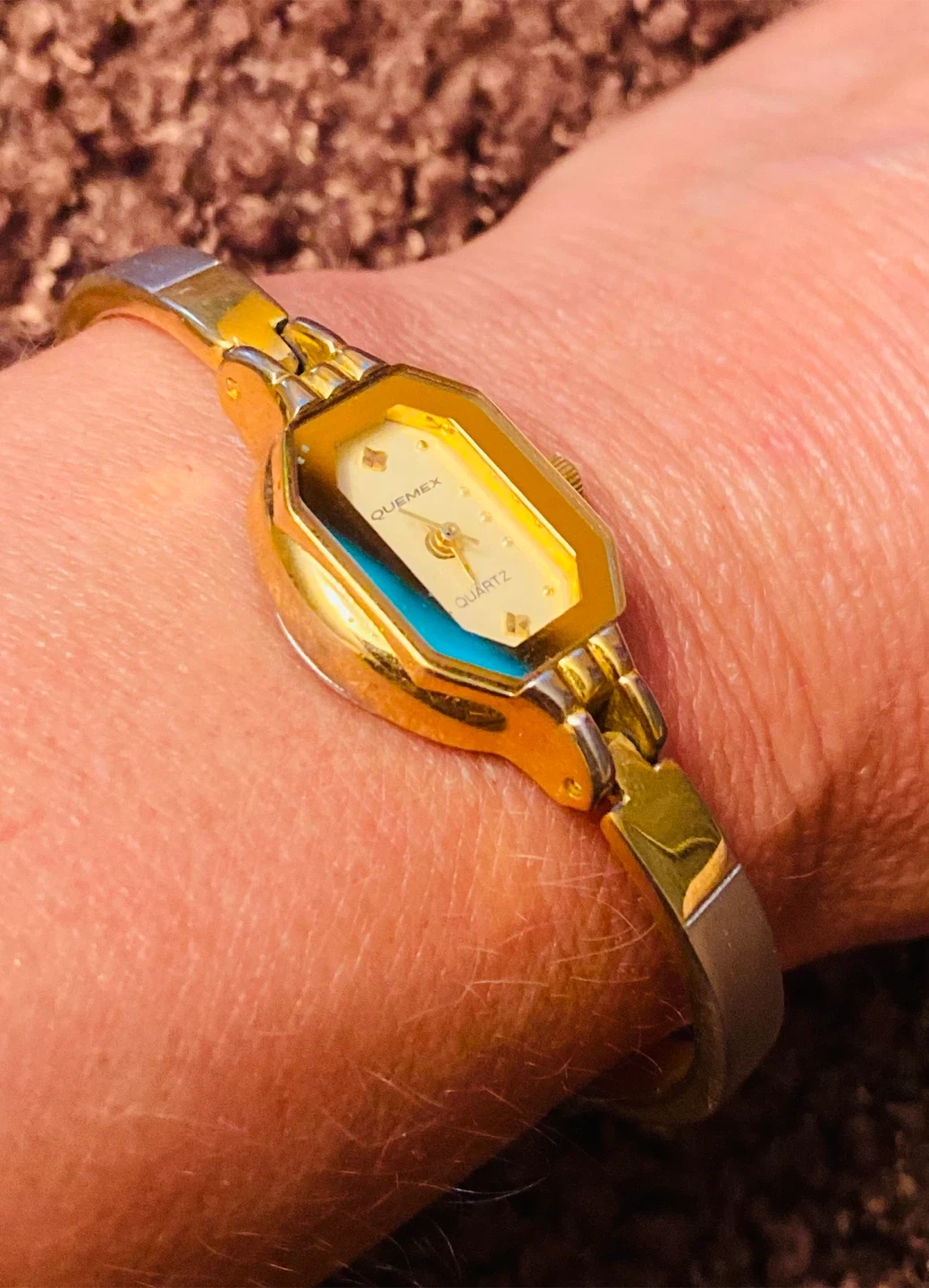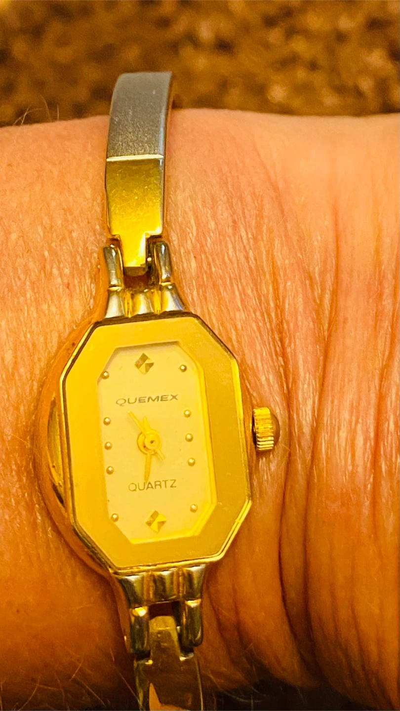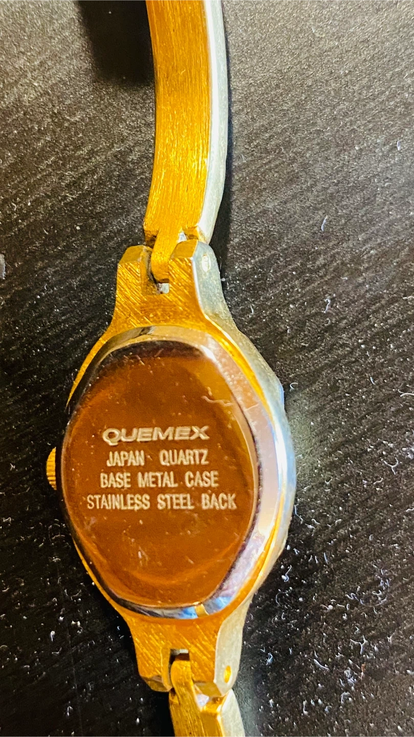 Selling a QUEMEX quartz women's watch with a gold and silver tone bracelet. The case is made of base metal with a stainless steel back. It's a stylish and classic timepiece!