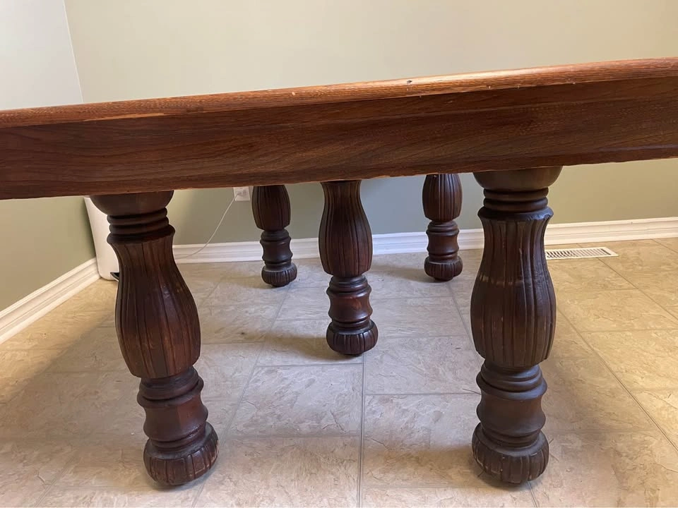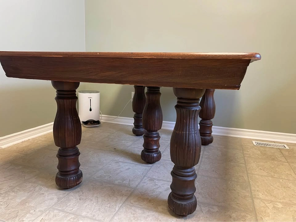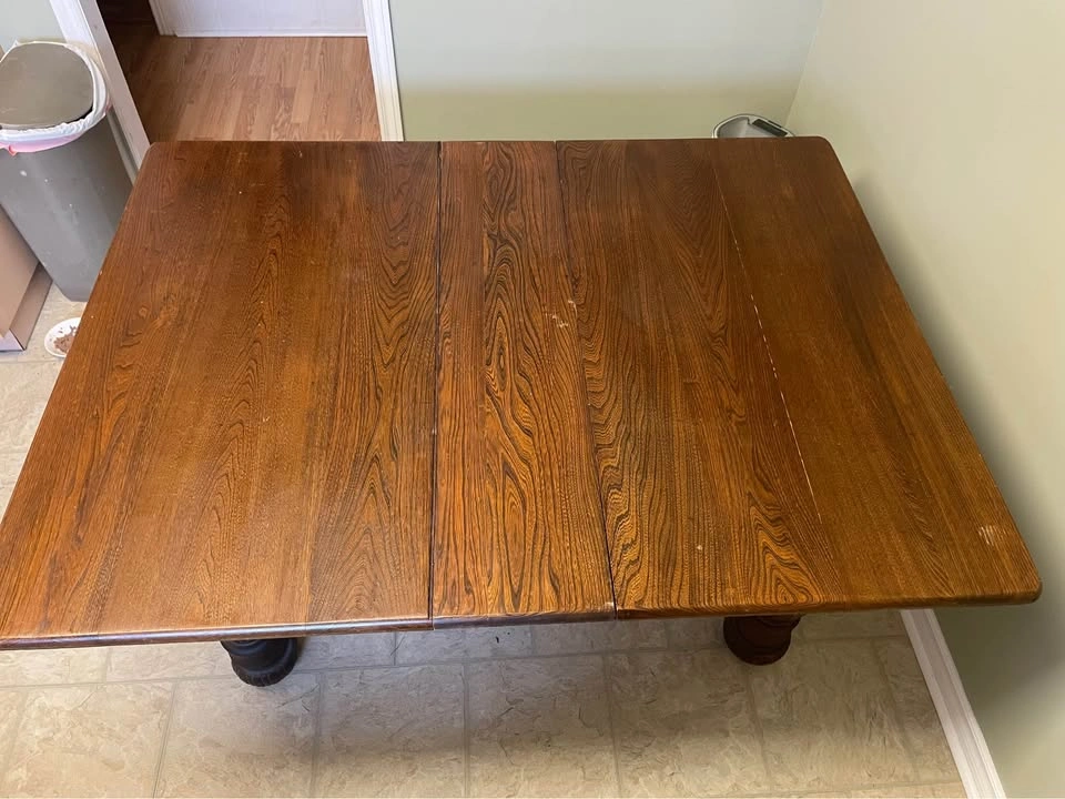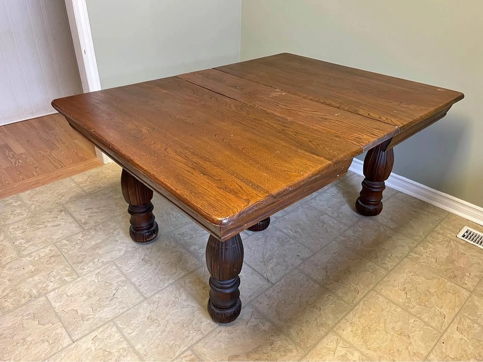 Solid wood antique table with one leaf. Cannon ball legs. 44”x48” without leaf and 44”x58” with the leaf in. Approximately 29” high. There is one seam that needs to be glued. $225. Pick up Beaverton.