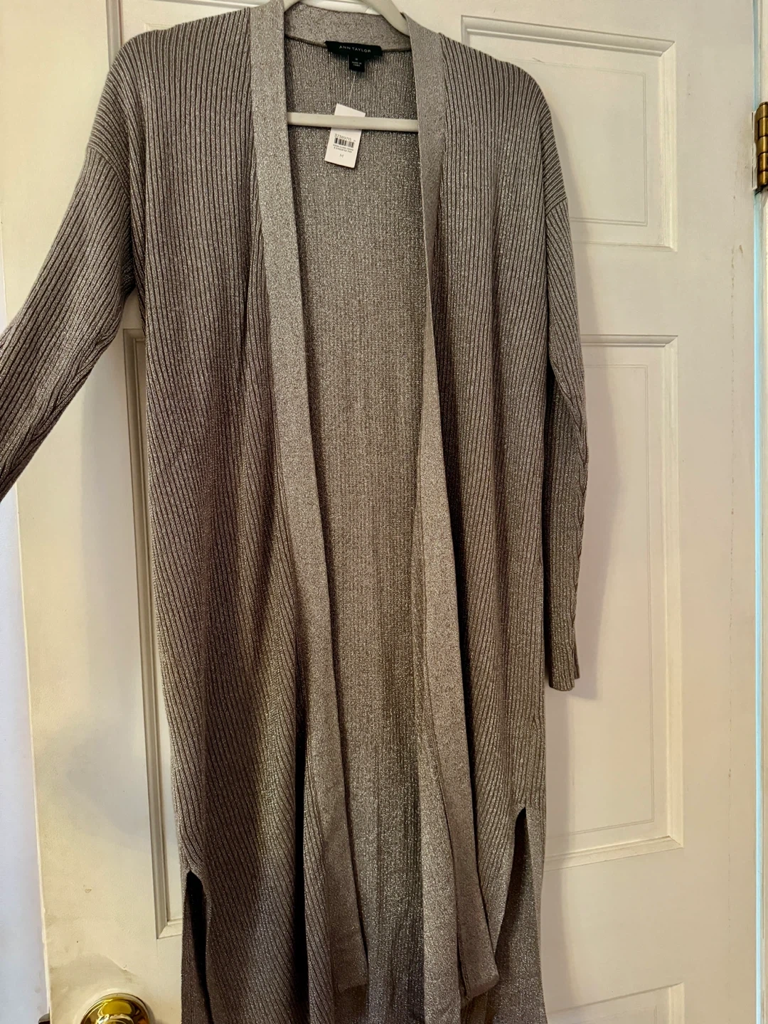 353Selling a beautiful Ann Taylor cardigan in size M! It's a stylish and comfortable piece. The material has a ribbed texture with a subtle shimmer. Perfect for layering!