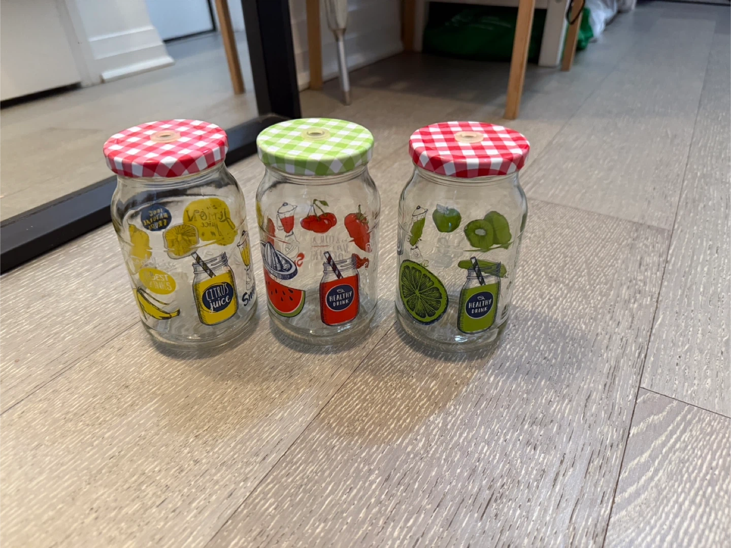 Buy & SellCute drinking Glass Jars with Lids (Set of 3)Cute drinking Glass Jars with Lids (Set of 3)$3Selling a set of three adorable glass jars! They have cute fruit designs and checkered lids in red and green.ConditionLike new0 chats·0 favorites·19 viewsSELLERverifiedRKOld Toronto1000+338 reviewsWHERE TO MEETMercer and John street