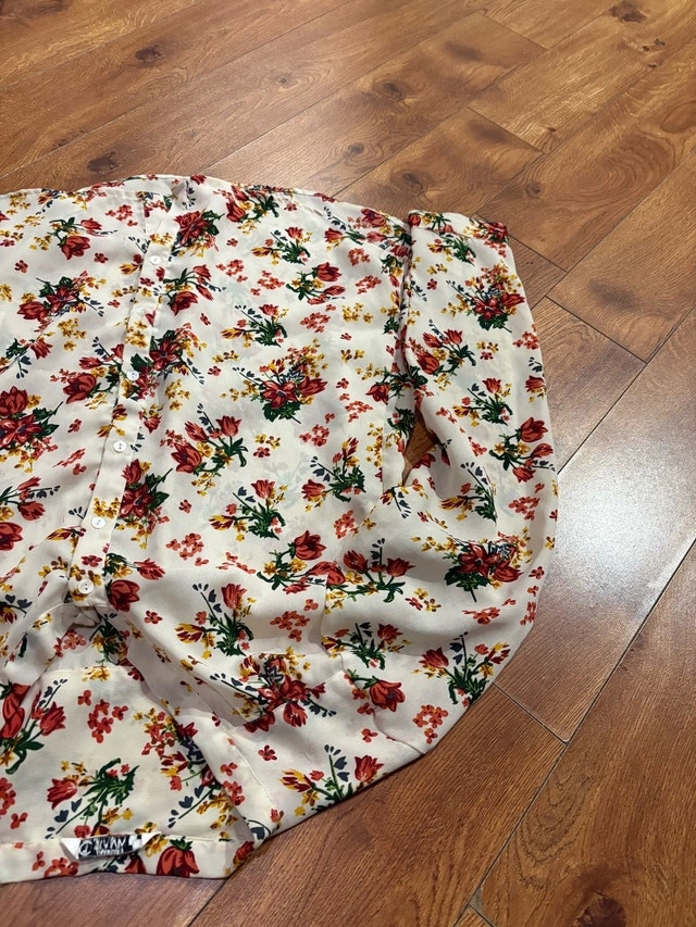 This RW&Co blouse features a beautiful floral pattern and long sleeves, perfect for adding a touch of elegance to any outfit. It is in good condition and ready for a new home. Additional Details: * Brand: RW&Co * Pattern: Floral * Sleeve Length: Long Sleeve It's waiting for you to pick it up. If you see this ad, the blouse is still available!