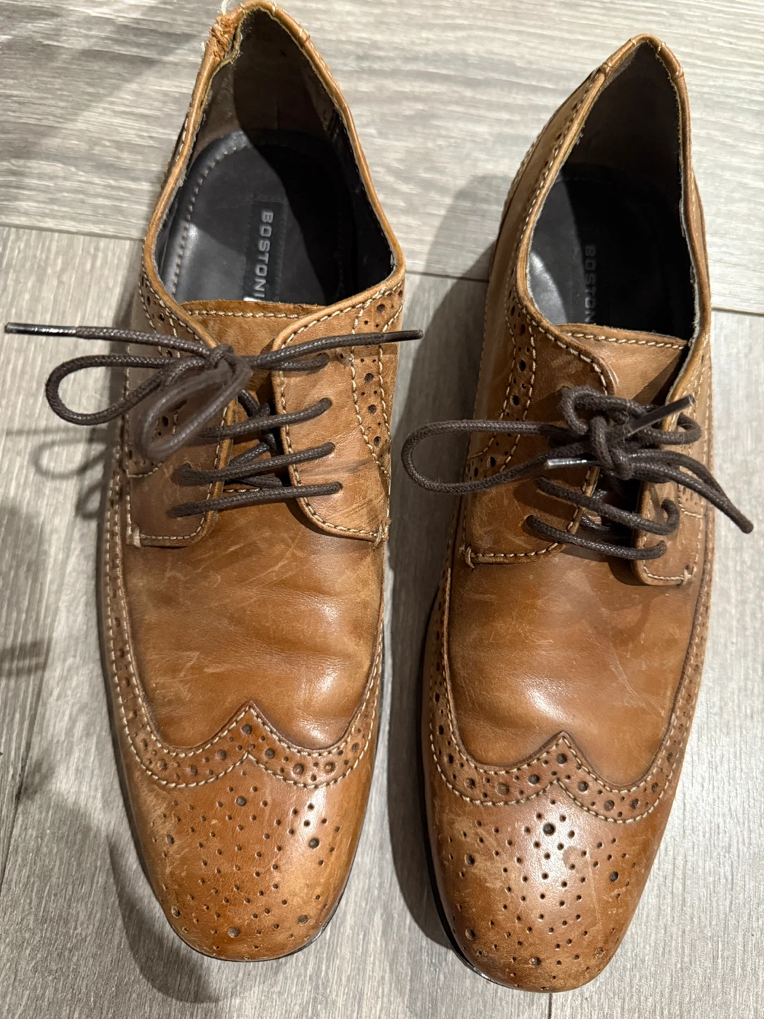 Selling a pair of Bostonian dress shoes. They are size 9M and made of genuine leather. These shoes have a classic wingtip design with brogue detailing. They are in good condition with some signs of wear.