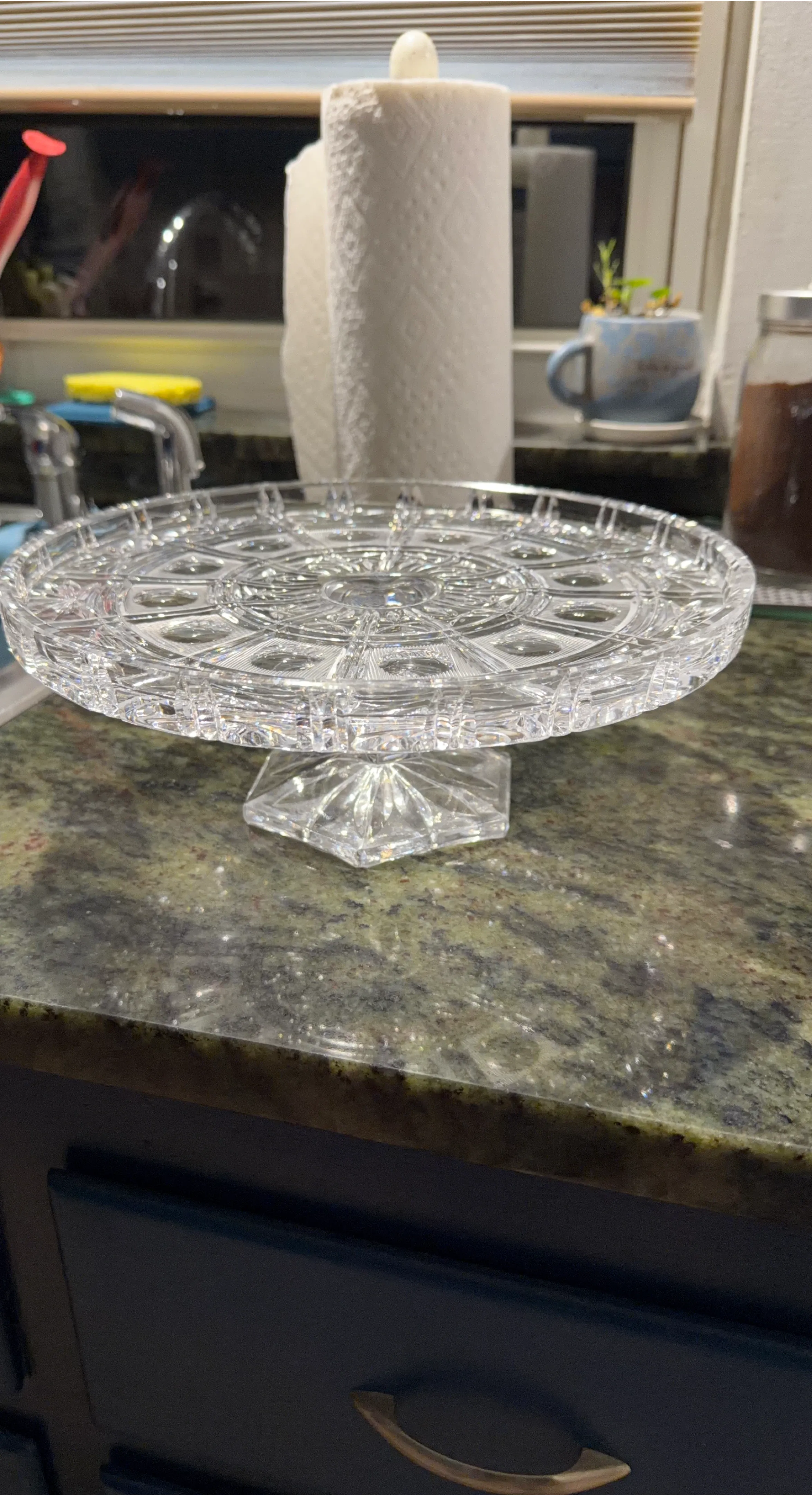 Selling a lovely crystal cake stand. It's perfect for displaying cakes or other desserts. The stand has a beautiful design and is in great condition. It will surely add a touch of elegance to any table setting
