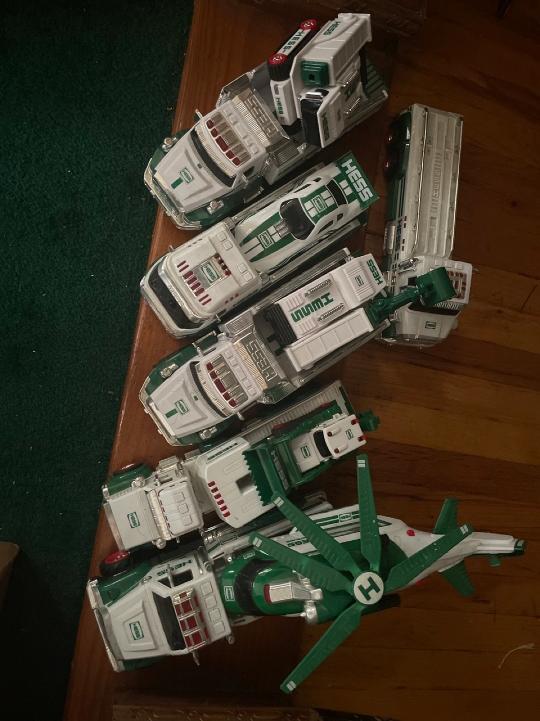 Selling a collection of Hess toy trucks! They are white and green, and include a variety of models like a helicopter and a truck with a trailer. Great for collectors or kids who love toy vehicles