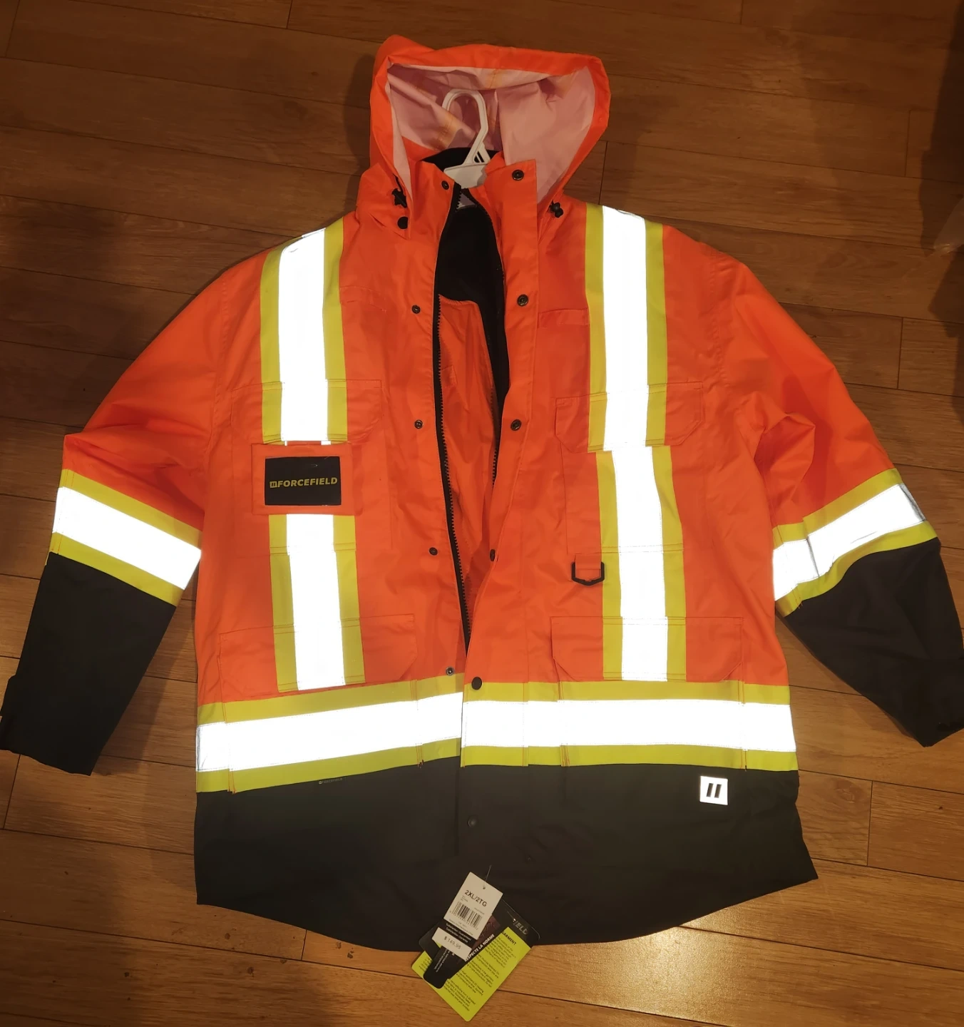 High visibility. Heavy duty. Good quality. Warm. Lots of inner and outer pockets.
