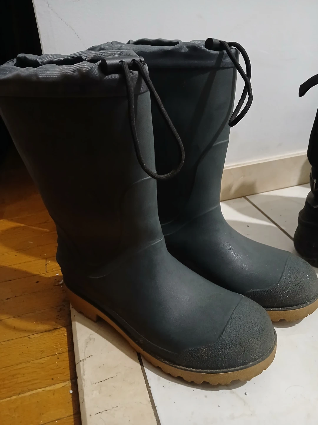 Selling a pair of grey rubber boots. They are in good condition and ready for the rain or snow! Size 11.