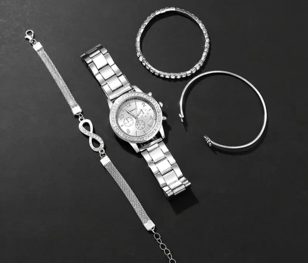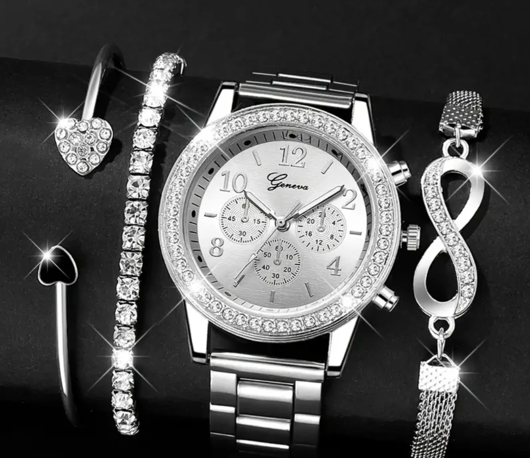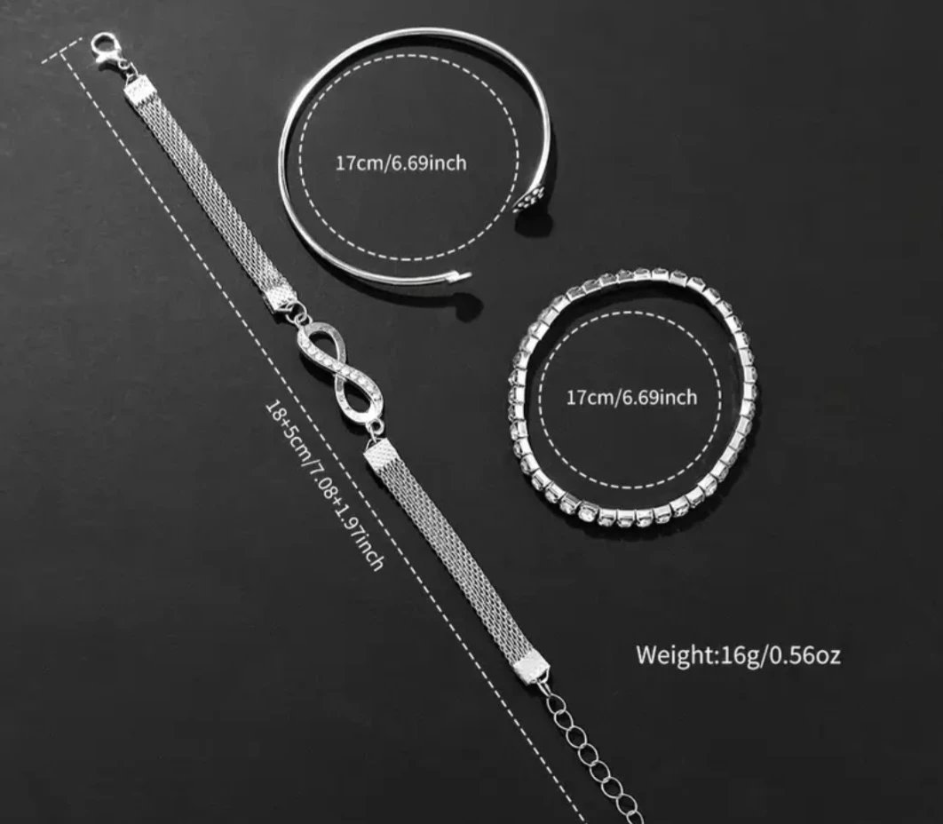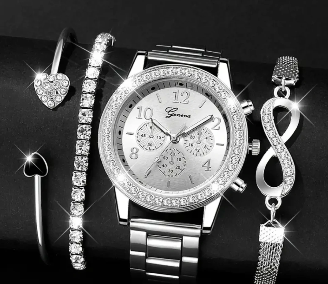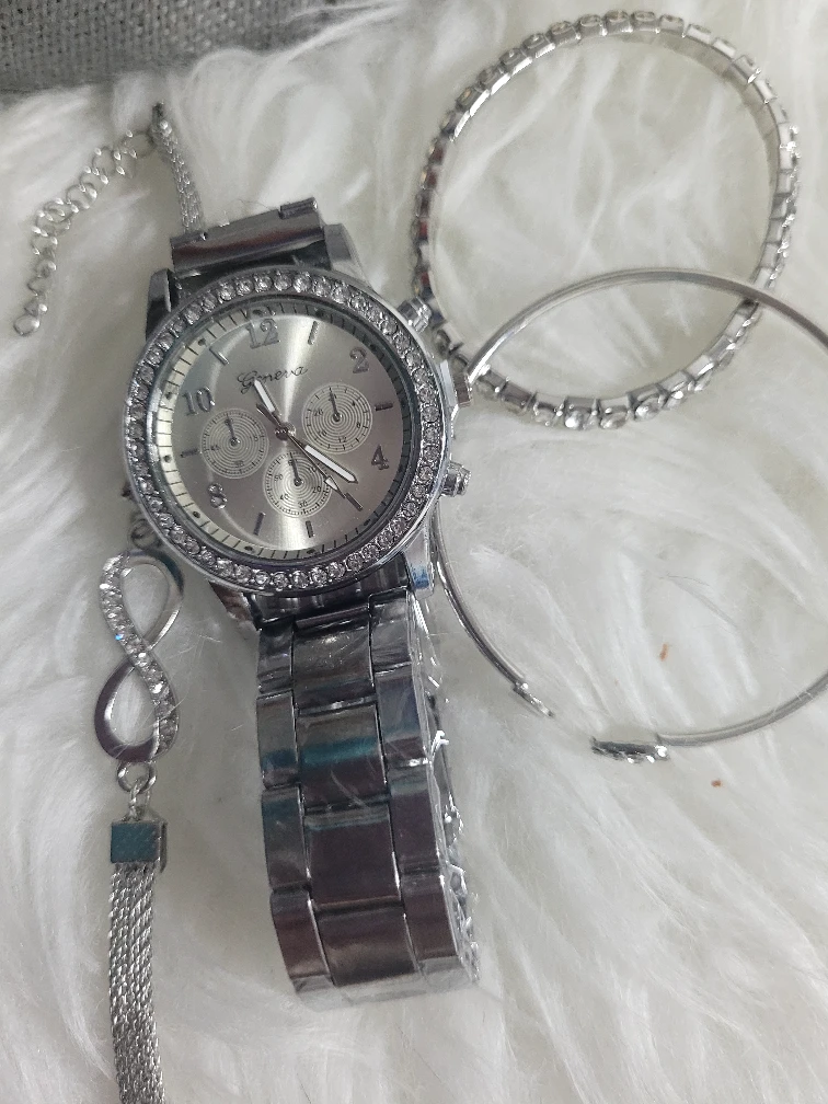 This set includes a Geneva watch with a silver band and a sparkly bezel, along with matching bracelets! The bracelets are about 17cm/6.69inch in diameter, and one of the bracelets is 18+5cm/7.08+1.97inch long