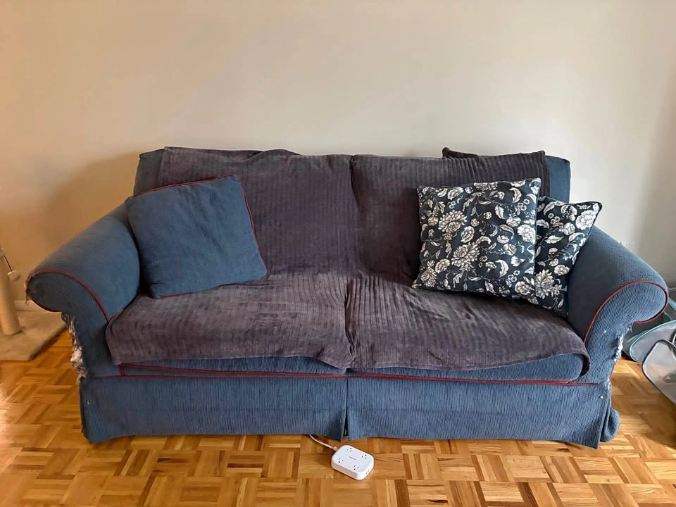 181There are some cat scratches on the front of the arms but no structural damage, would be easy enough to repair. Couch is in otherwise good condition, very comfy and cozy. Includes the cushions, their covers and the throw. pickup only