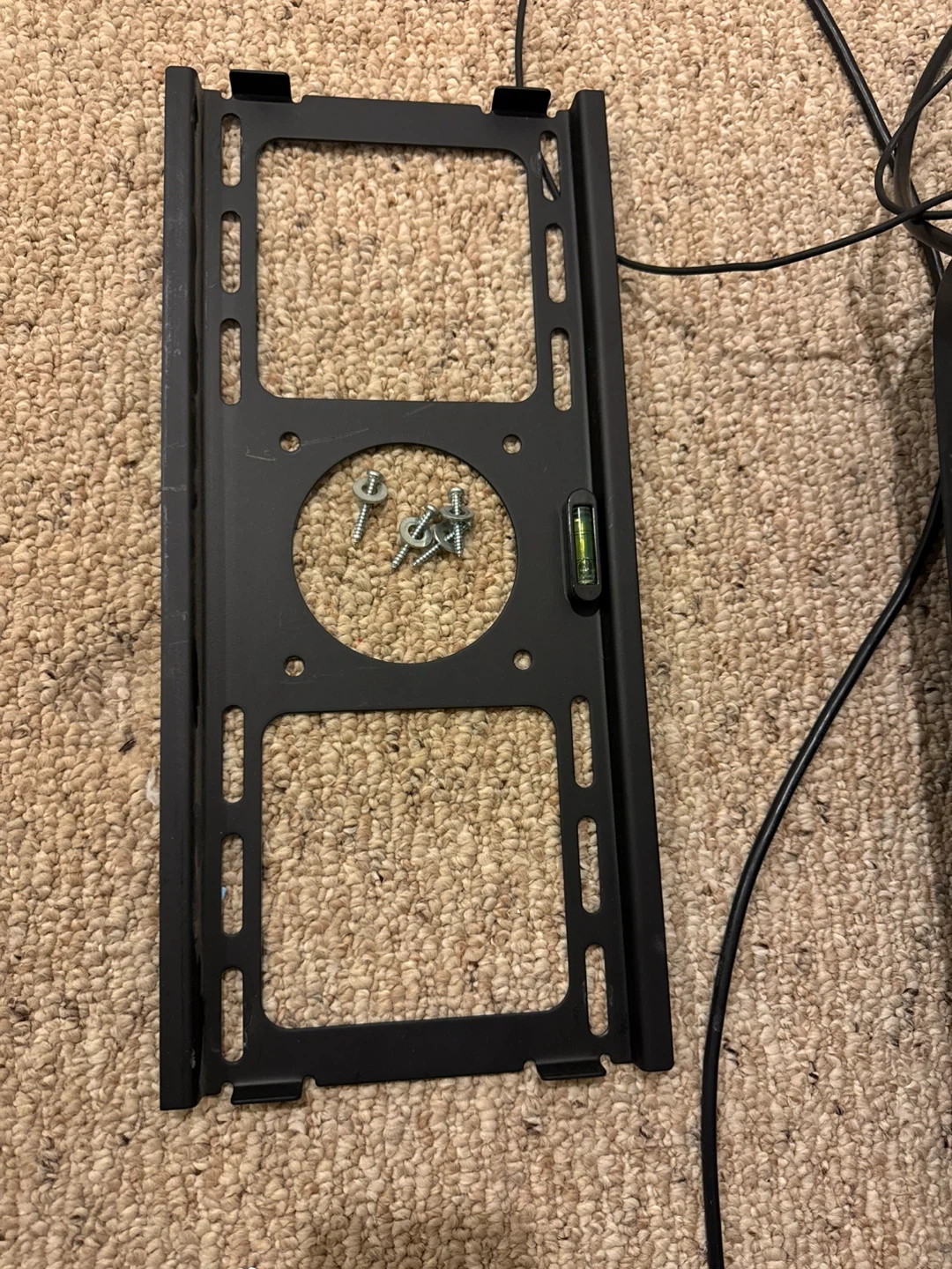 This is a black metal TV wall mount bracket. It includes a built-in bubble level for easy installation. Several screws are provided for mounting. Fits most TVs.