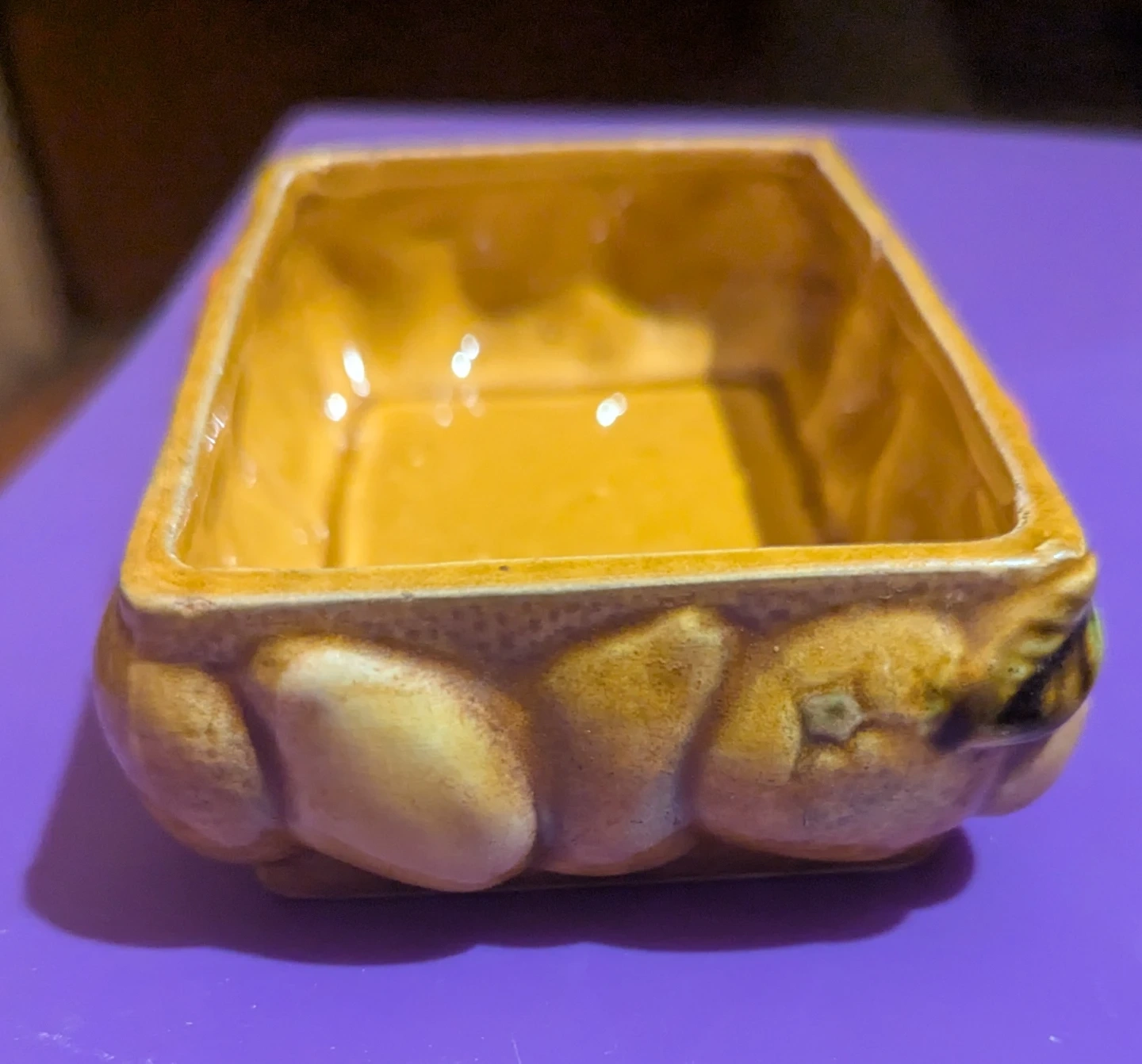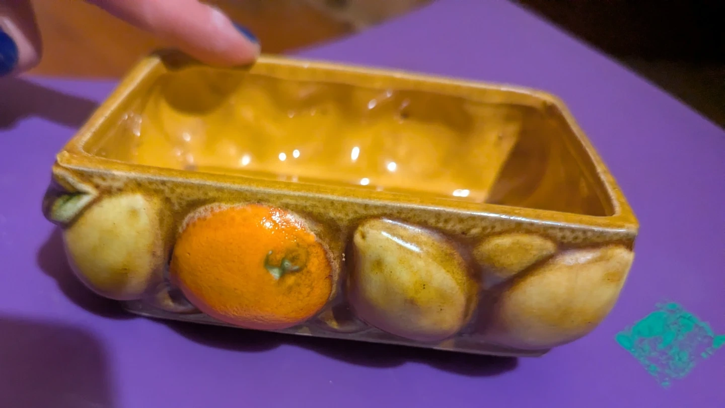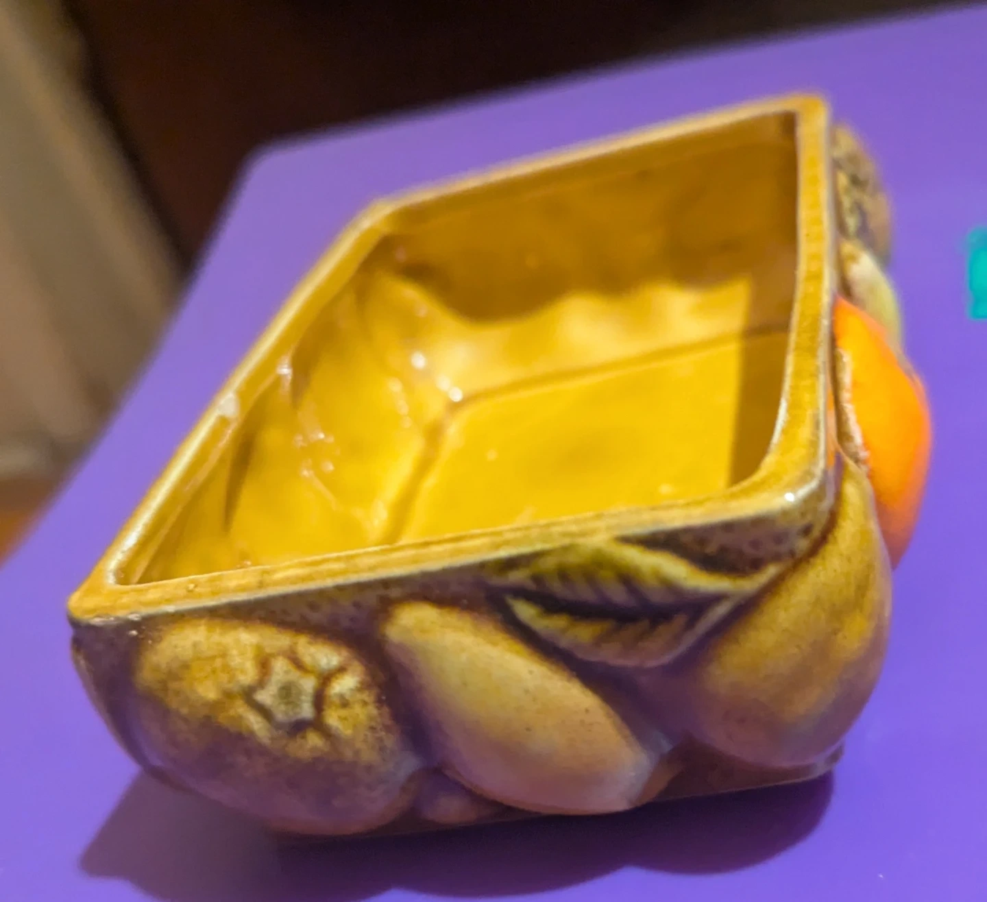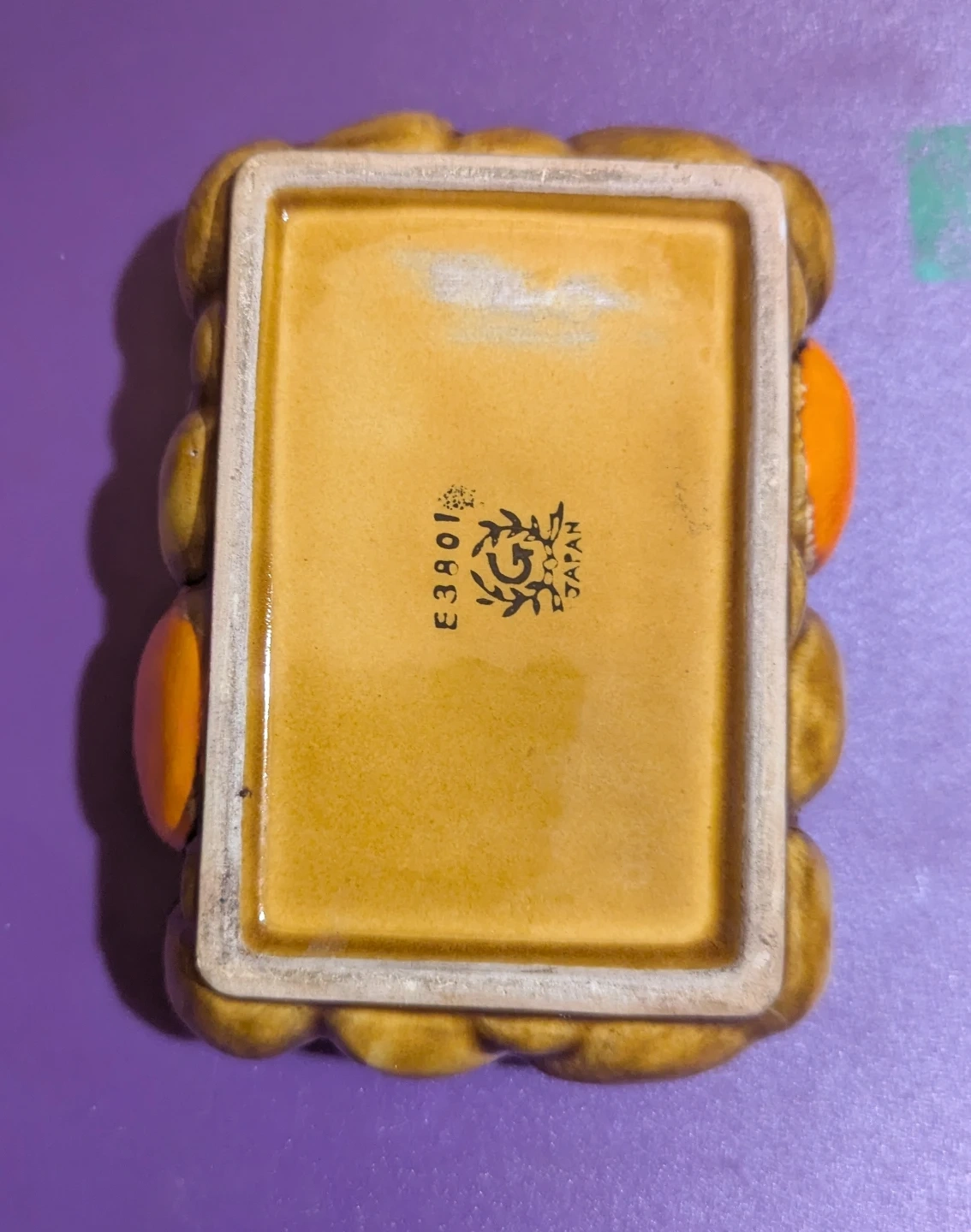 Here's a cute vintage ceramic dish made in Japan. It features a raised fruit design around the outside. Perfect for adding a touch of retro charm to your home!