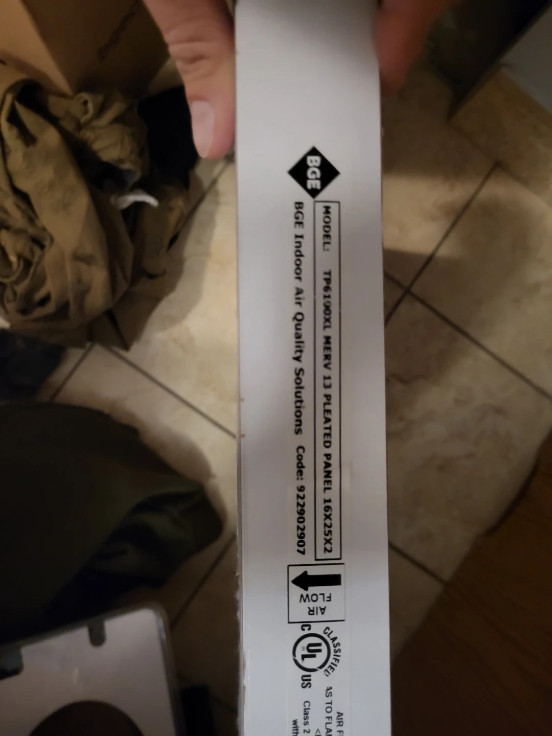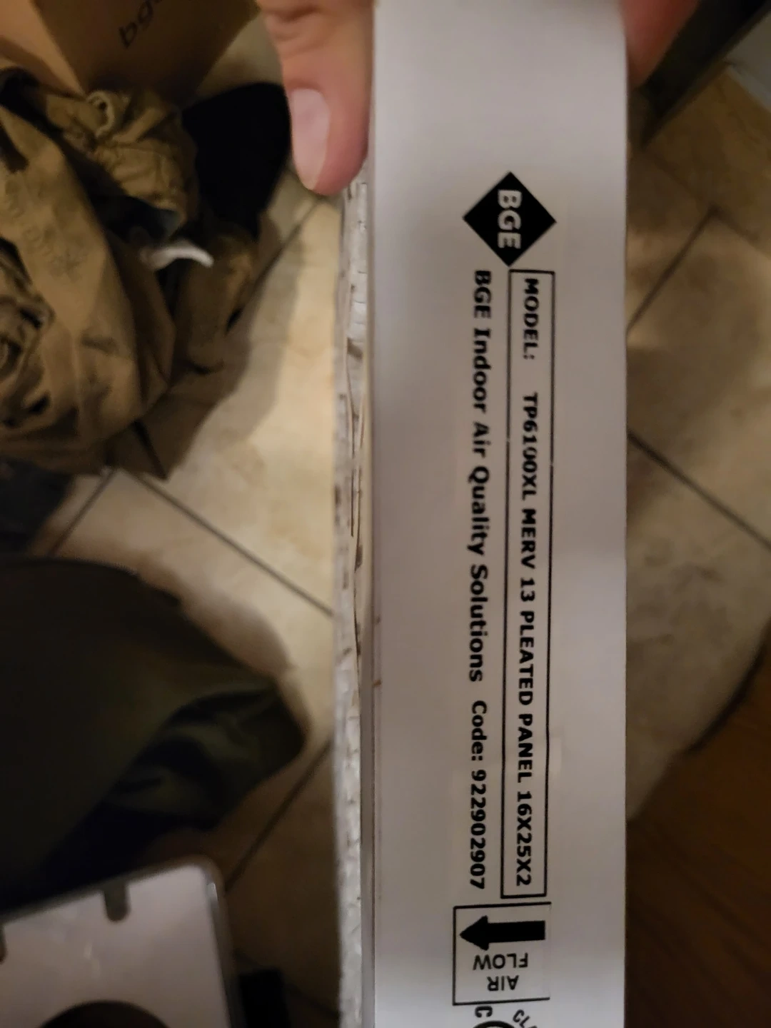 Selling a BGE Indoor Air Quality Solutions pleated panel. The model number is TP6190XL. It's a MERV 13 filter with dimensions 16X25X2