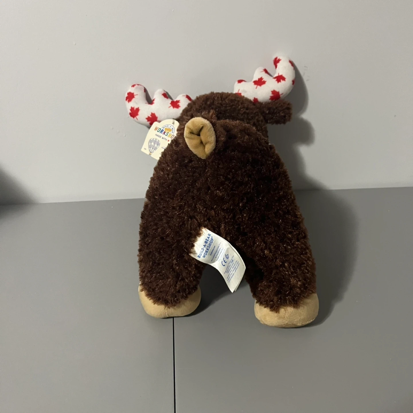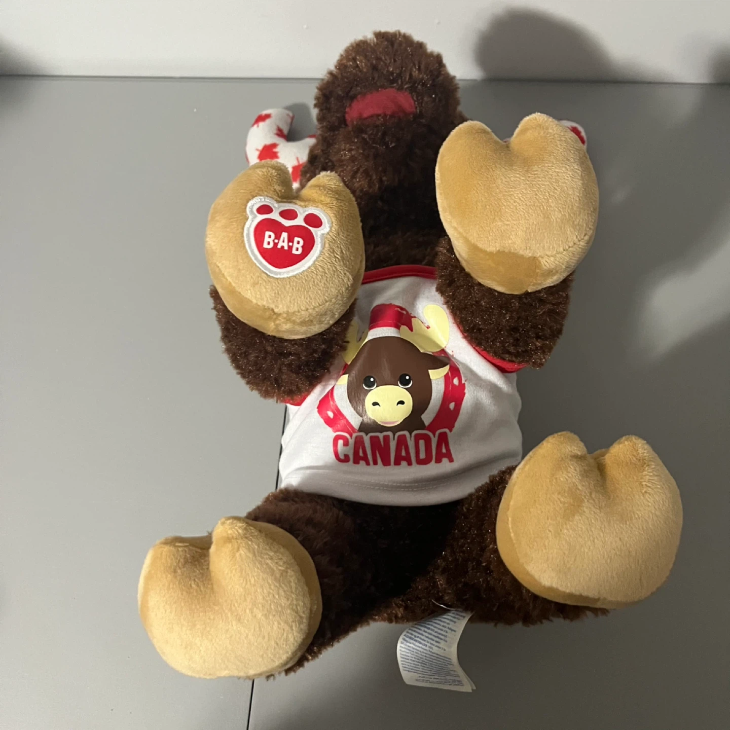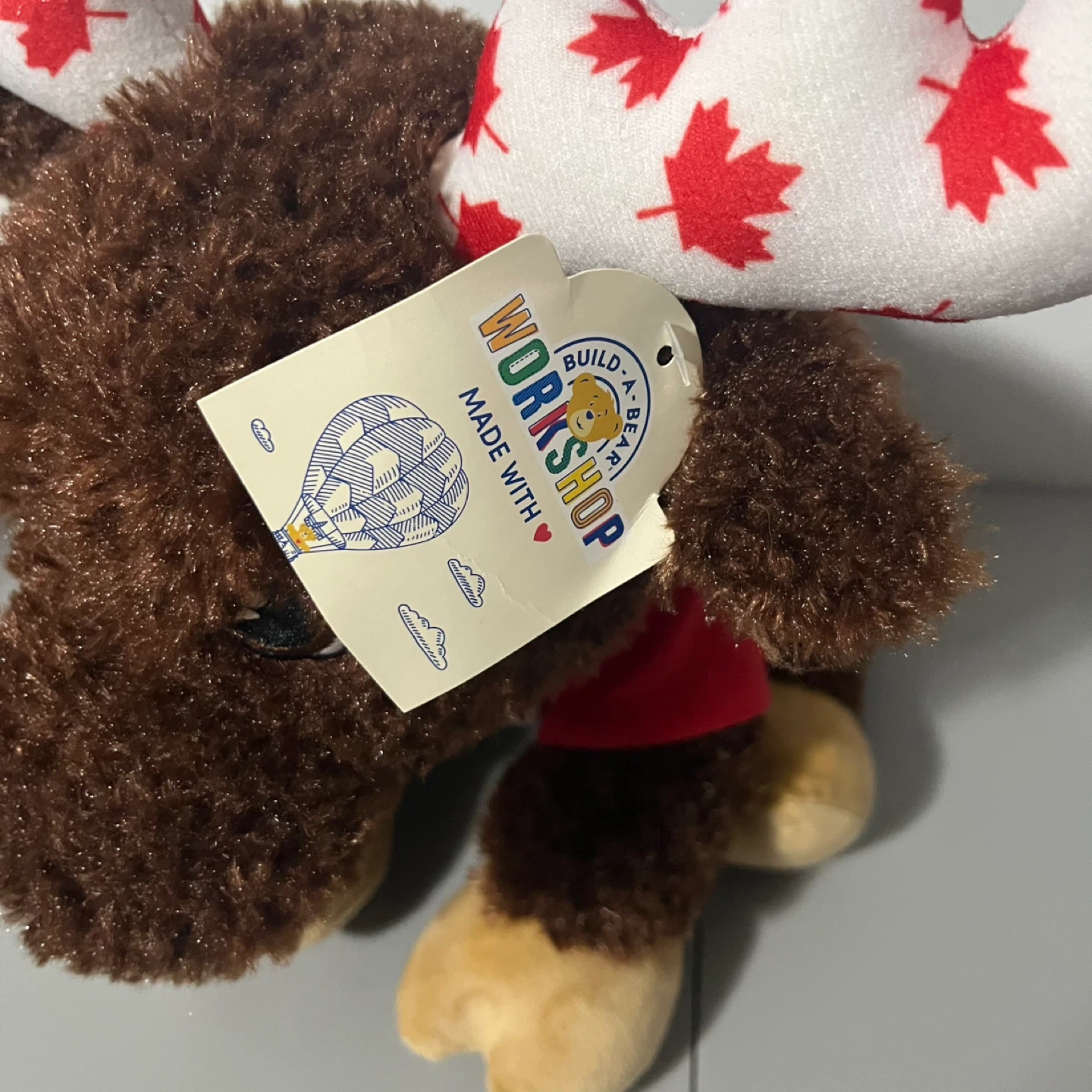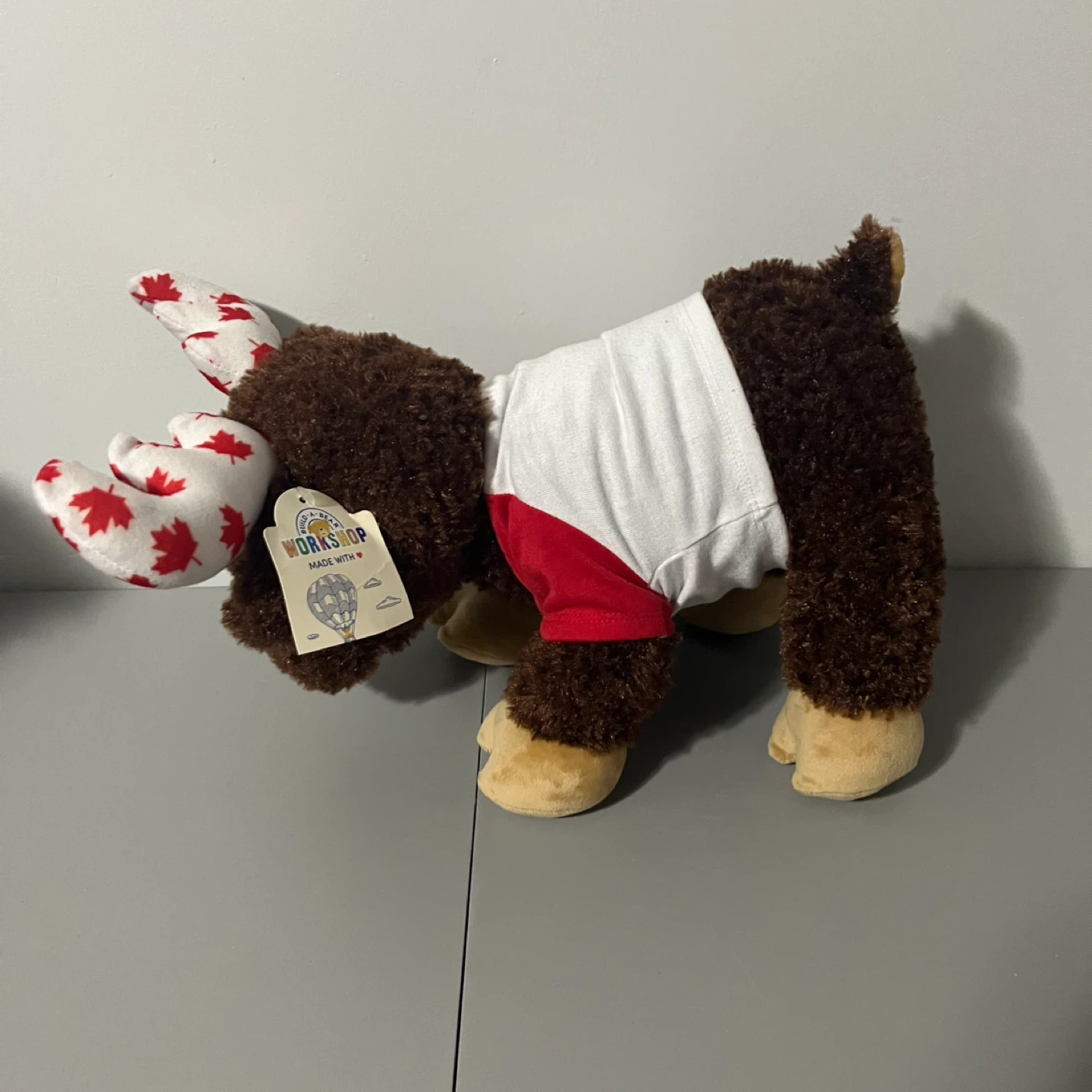 Selling a Build-A-Bear moose plush! It's wearing a cute Canada shirt and has antlers with maple leaves. Perfect for anyone who loves Canada or Build-A-Bear collectibles